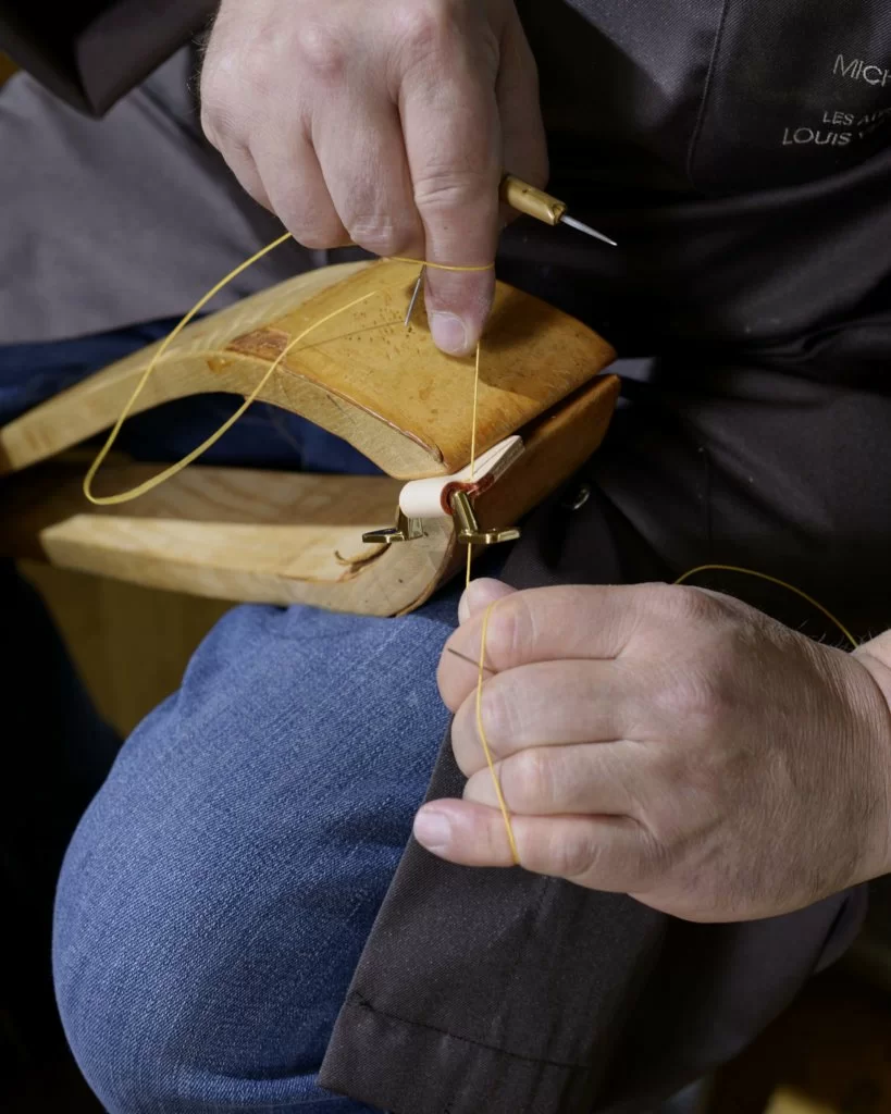 這是Asnières工場保存下來的傳統馬鞍縫紉法,圖中工匠正以兩支針穿上蜜蠟麻線鞏固行李箱上的牛皮手柄。