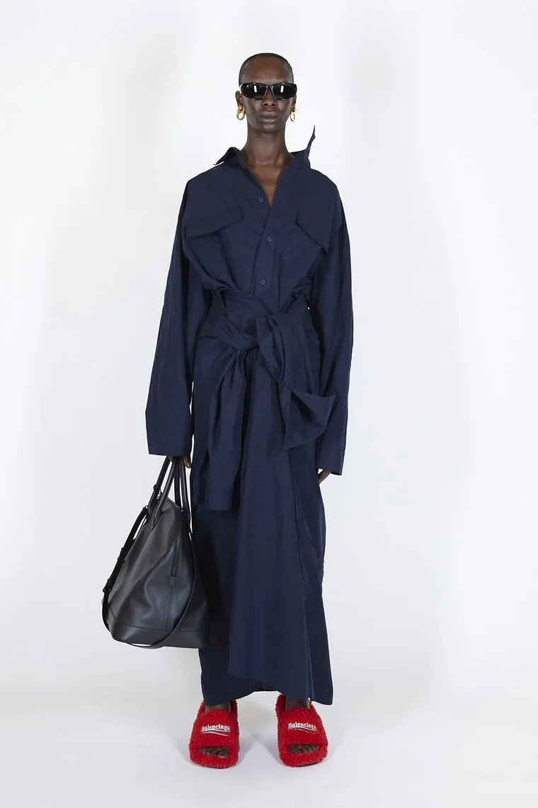 Balenciaga自Demna Gvasalia上任創意總監後風格愈走街頭化,在SS21系列中亦不乏一些玩味性質較重的造型,例如以trench coat造型配搭拖鞋,上身極為優雅,下身則極為隨性,正好切合法國女性那種漫不經意的優雅造型。