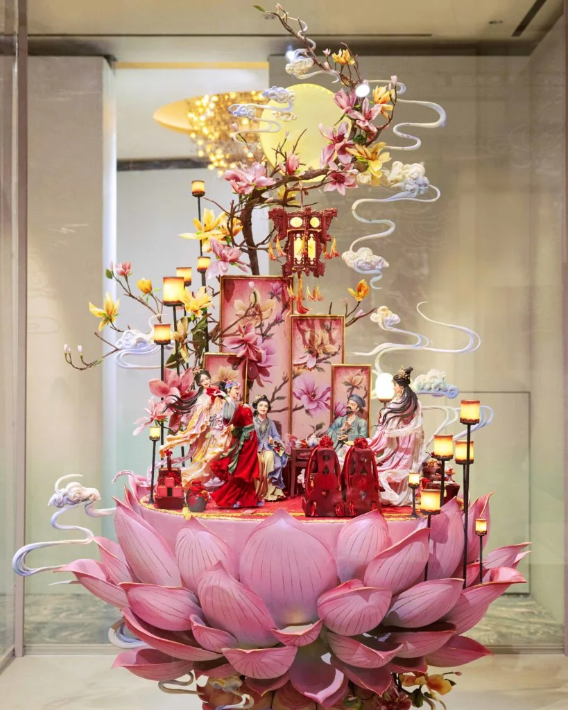 展品《親迎》與《納徵》是中國古代漢族婚姻習俗「三書六禮」的其中二禮,分別代表成親拜堂禮及過大禮。《親迎》借鑒中國榫卯工藝,以懸浮的大紅燈籠作為底座,一對新人正在行拜堂禮,新娘身穿「龍鳳裙褂」,表達喜慶的祝福。為突出《納徵》的氛圍感,周毅以翻糖彩繪及模擬花卉工藝,將盛開的玉蘭花由平面跨越到立體。