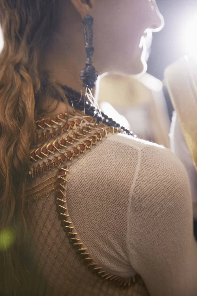 除了Lesage,今個系列中有不少釘珠刺繡的設計是出自另一個刺繡工坊Atelier Montex。這家成立於1939年的工坊擅長使用十九世紀的Cornely機器編織,原理是以機器預先在布料上依圖樣做出一層鑲珠縫線,再人手用鈎針將珠子、亮片等縫上衣服,達到完美的刺繡效果。系列中的一條金色珠鏈紗裙就是由此而來,先用Cornely機器在白色薄紗上造出由金色珠鏈構成的漁網圖案,再於腰間和領口位置繡上玻璃和金屬管造成Art Deco元素的立體裝飾,卻依然保留薄紗的柔軟,極考功夫。