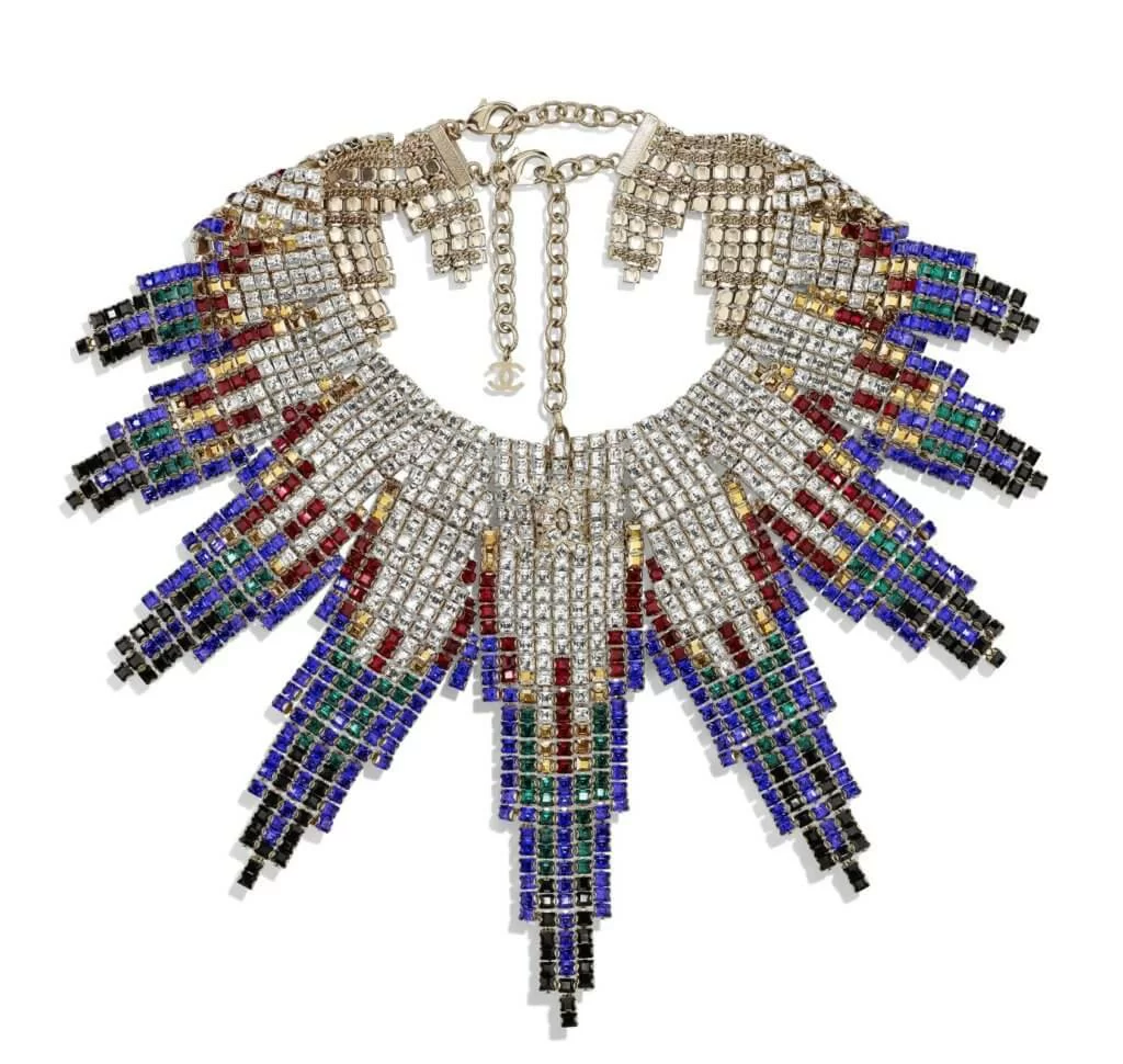 系列中最矚目的Art Deco頸鏈由專造珠寶配飾的Desrues工坊所製,由工匠人手鑲上一千五百顆色彩鮮豔的水鑽而成,營造出曼哈頓天際線的效果。