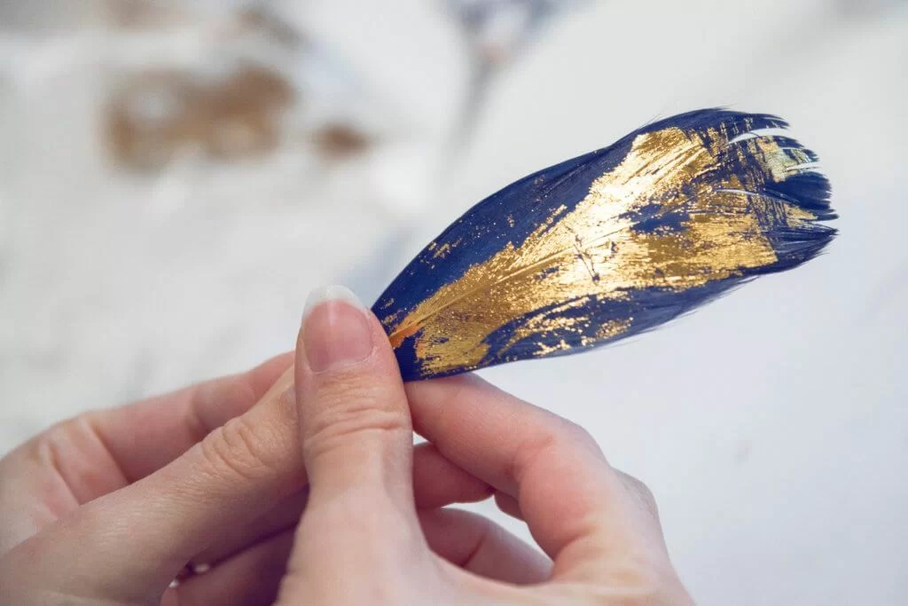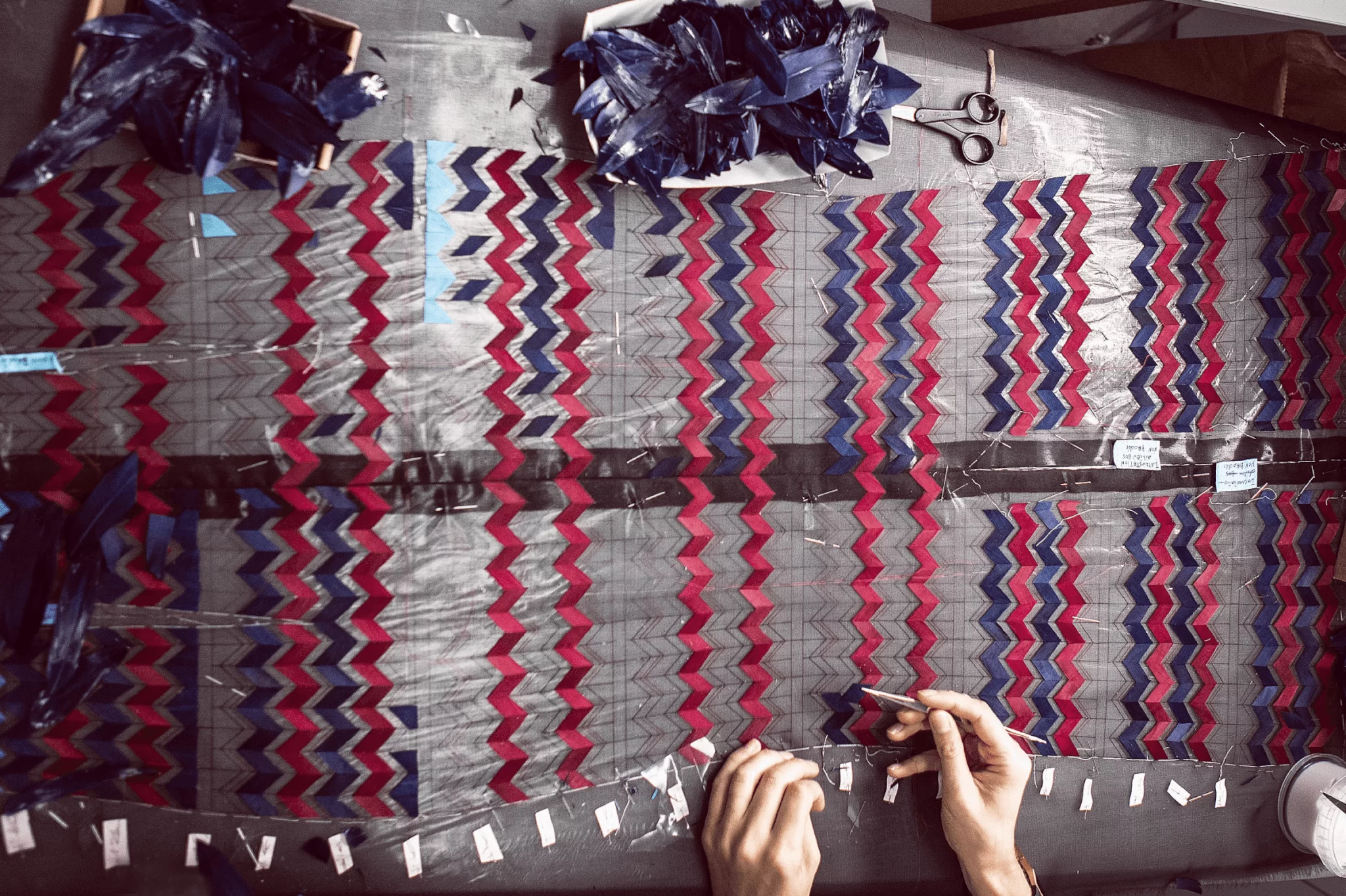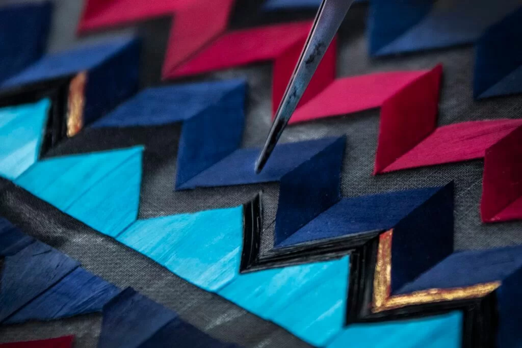 Lemarié為了製作綴滿幾何圖案的羽毛長裙,先要將每塊羽毛染成紅、深藍、綠松石和黑色,再在羽毛上手繪金色筆觸。處理好羽毛之後,再人手切割成幾何圖形,一行一行地嵌到黑色紗裙之上。
