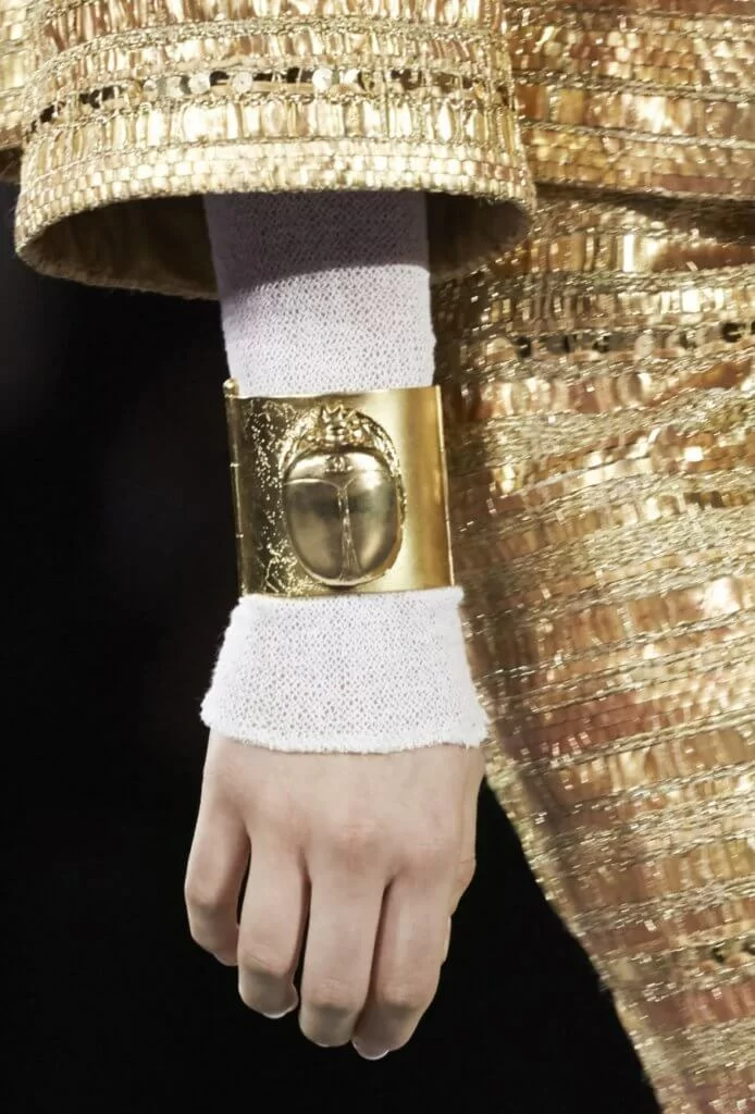 為品牌鑲製珠寶裝飾的還不只Desrues,Goossens是Chanel女士自1950年代便起用的金匠,今趟首次與品牌合作創造Métiers d’art系列。Karl Lagerfeld以古埃及文化常見的聖甲蟲為符號貫穿整個系列,鈕扣、腰帶、手環上所見的聖甲蟲正是出自Goossens,用上創始人Robert Goossens的模具造出聖甲蟲的立體輪廓,再鑲上青金石,並在背面刻有埃及象形文字,就連微小若此的細節也少不了工藝。