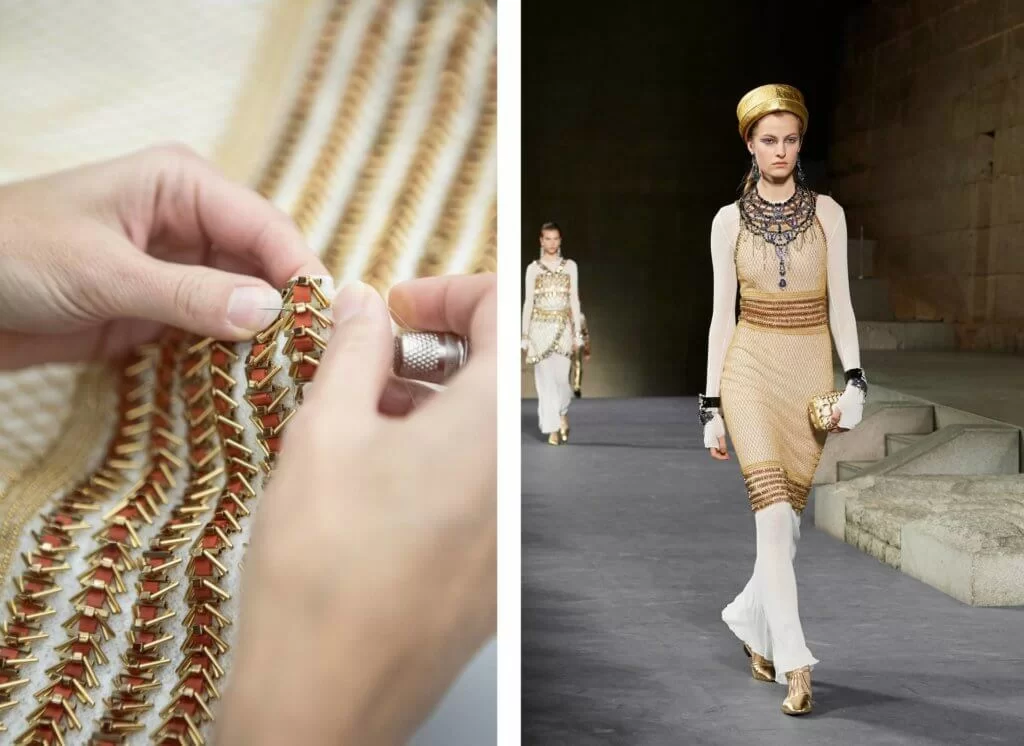 今個系列主要匯集了Desrues、 Lesage、Maison Michel、Lemarié、Lognon、Goossens、Massaro、Atelier Montex等工藝坊的心血,合力將Karl Lagerfeld所想像的埃及體現在衣服配飾之上。當中與品牌合作最久的Desrues工坊專門製造珠寶裝飾,兩者淵源始於1965年,工坊創辦人George Desrues為Chanel女士創作了第一個鈕扣,也為西敏公爵鑲製不少珠寶作禮物送給Chanel女士,自此品牌服裝上的鈕扣、珠寶飾物大都出自工坊,每天四千粒鈕扣、每年八個珠寶配飾系列均在這裏生產。在這個系列,工匠們從原始的一片金屬錘打成項圈、耳環及胸針等,並鑲上珍珠凸圓形寶石及青金石,又或刻有古埃及視為神聖動物的甲蟲圖案。而系列中最矚目的Art Deco元素頸鏈則以品牌1920年代的典藏為藍本,以色彩燦爛的馬賽克寶石營造出曼哈頓天際線的效果,同時又有古埃及王國的奢華感,是由工匠人手鑲上一千五百顆色彩鮮豔的水鑽而成,可以想像背後所花的時間與心機。