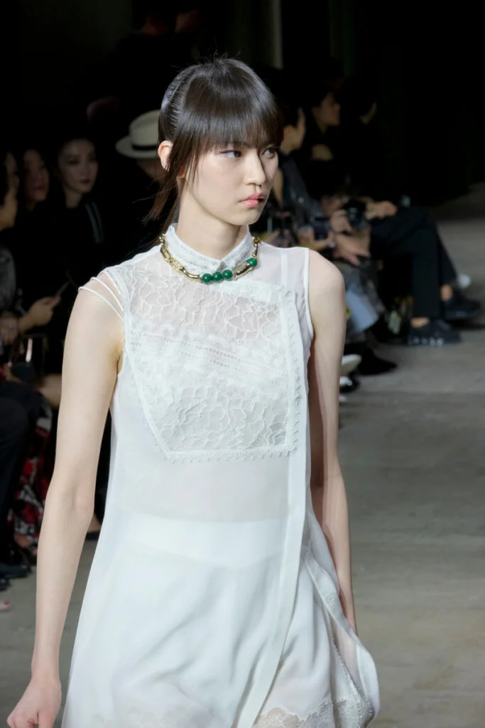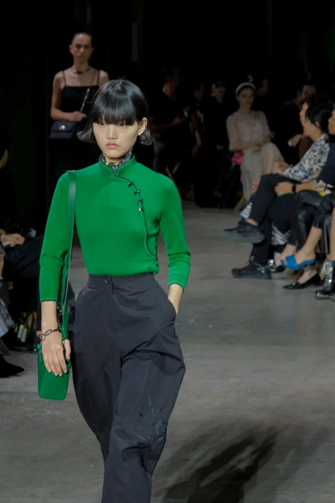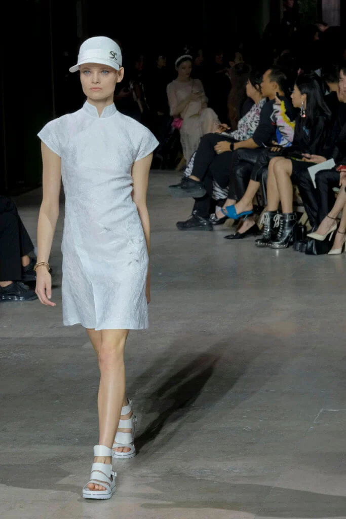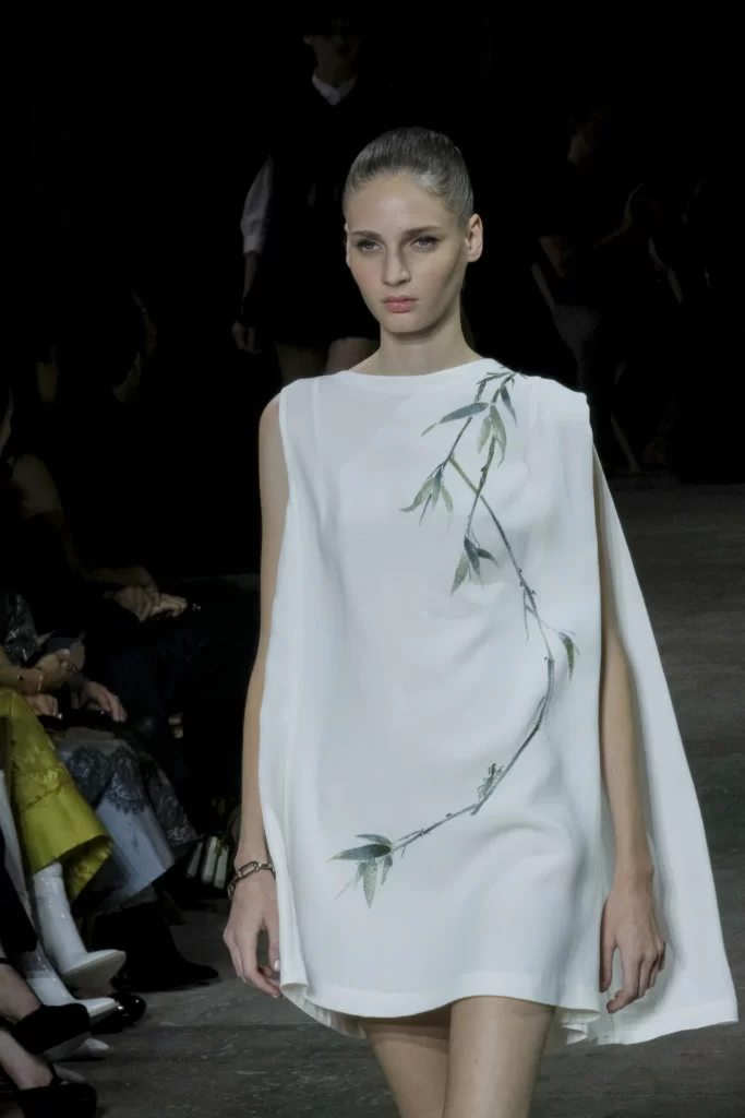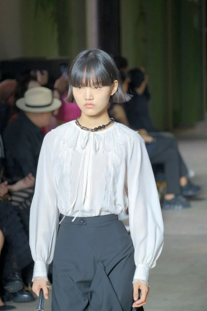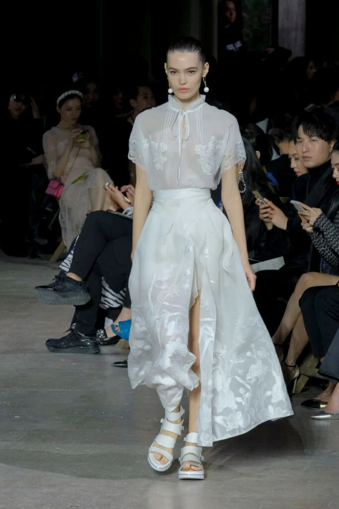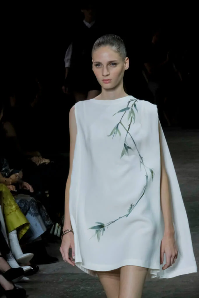 在總長超過千碼的烏干紗林立在會場之中,如置身竹林的蔥綠世界,模特兒行走時輕盈如風,原來,風是可以觸碰的。至於衣服方面,創意總監陳彩霞巧妙地加入蕾絲圖框繡花、肚兜元素,就算短裙和長裙都能夠做到飄逸的效果。最為詩意的是今季以一系列活潑的白描繪圖手法描摹竹林生態的圖騰,如蝴蝶、螳螂、蝸牛,構成一個翠葉竹林的自然景象,輕易展現女性優雅的氣質。坦白說,今年時裝周幾乎每一個品牌都向大自然、森林、綠色時尚致敬;但是SHIATZY CHEN令人欣賞的地方是,品牌從場地到服裝都讓觀眾恍惚走進張藝謀《十面埋伏》的現代版,就算女人穿著多麼性感的裙子,加上一對靈活走動的波鞋,已經能夠在生活的大小時刻鬆容動人,像五千年的歷史洪流,都可以與竹一樣無比堅韌。