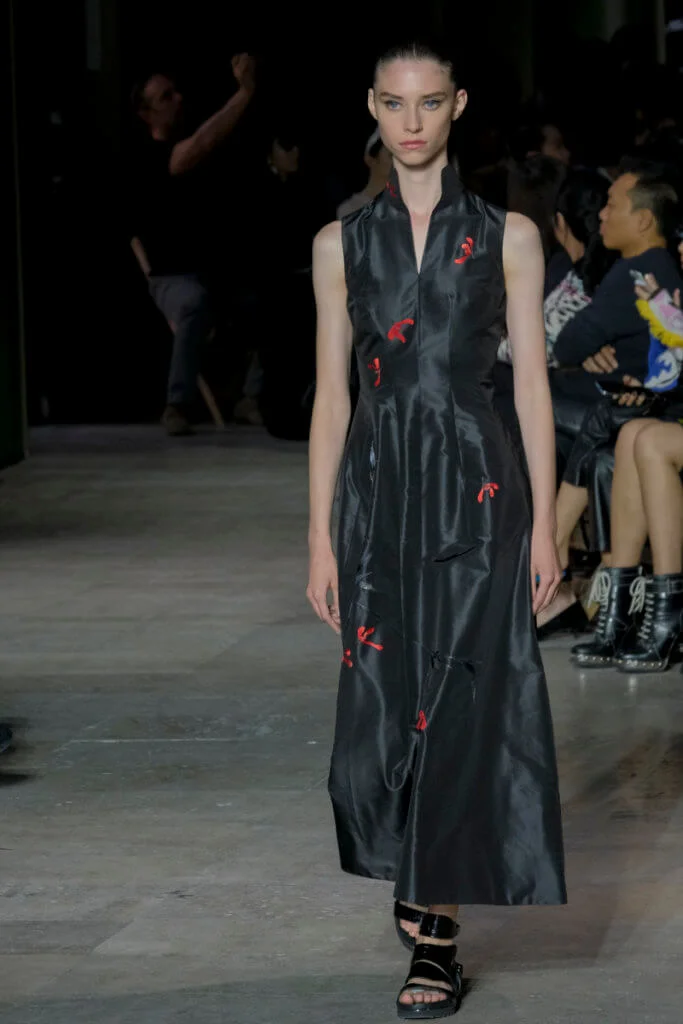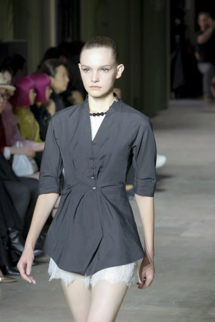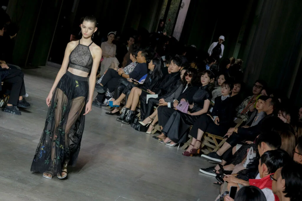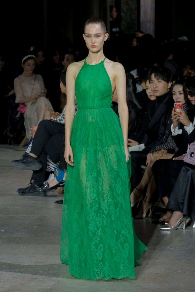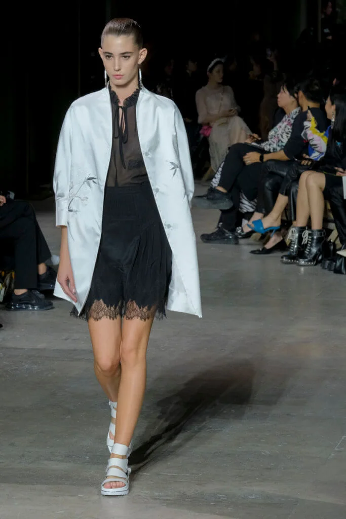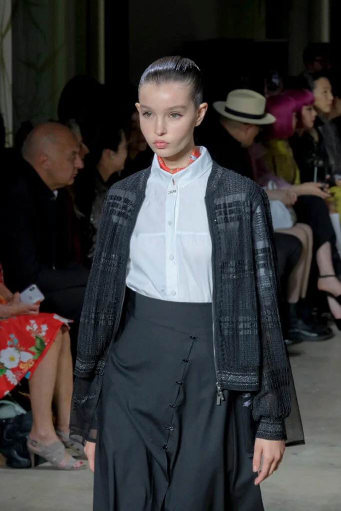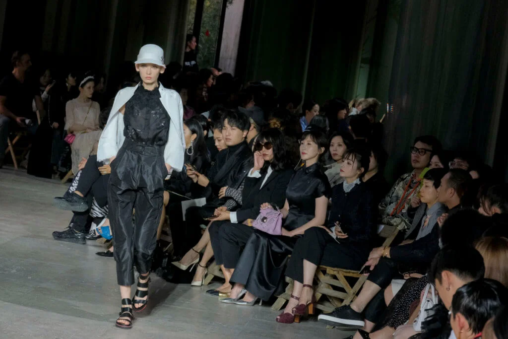 在總長超過千碼的烏干紗林立在會場之中,如置身竹林的蔥綠世界,模特兒行走時輕盈如風,原來,風是可以觸碰的。至於衣服方面,創意總監陳彩霞巧妙地加入蕾絲圖框繡花、肚兜元素,就算短裙和長裙都能夠做到飄逸的效果。最為詩意的是今季以一系列活潑的白描繪圖手法描摹竹林生態的圖騰,如蝴蝶、螳螂、蝸牛,構成一個翠葉竹林的自然景象,輕易展現女性優雅的氣質。坦白說,今年時裝周幾乎每一個品牌都向大自然、森林、綠色時尚致敬;但是SHIATZY CHEN令人欣賞的地方是,品牌從場地到服裝都讓觀眾恍惚走進張藝謀《十面埋伏》的現代版,就算女人穿著多麼性感的裙子,加上一對靈活走動的波鞋,已經能夠在生活的大小時刻鬆容動人,像五千年的歷史洪流,都可以與竹一樣無比堅韌。