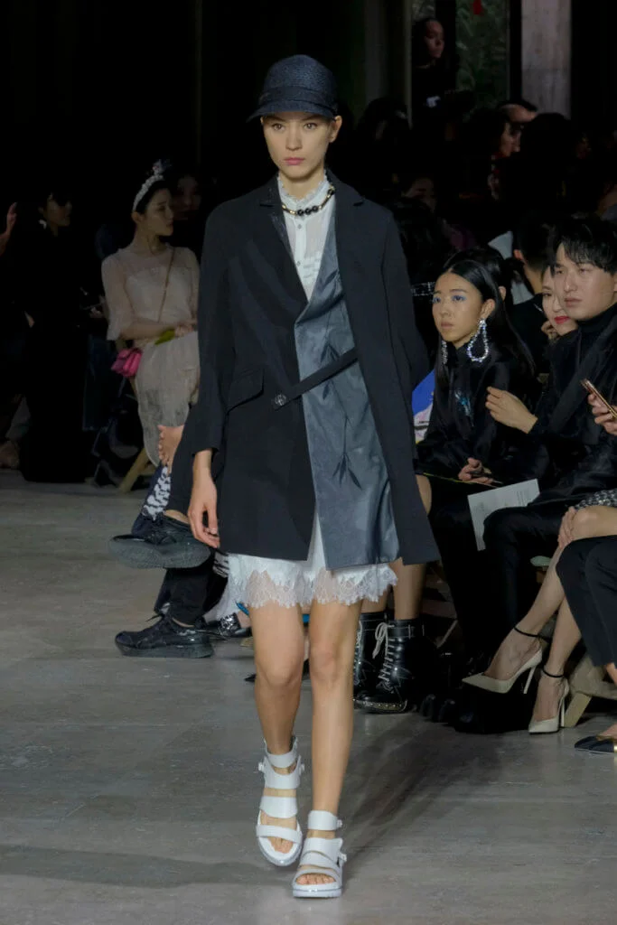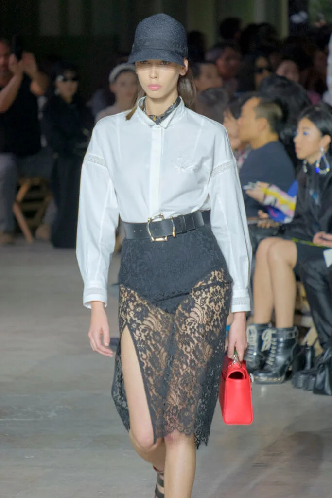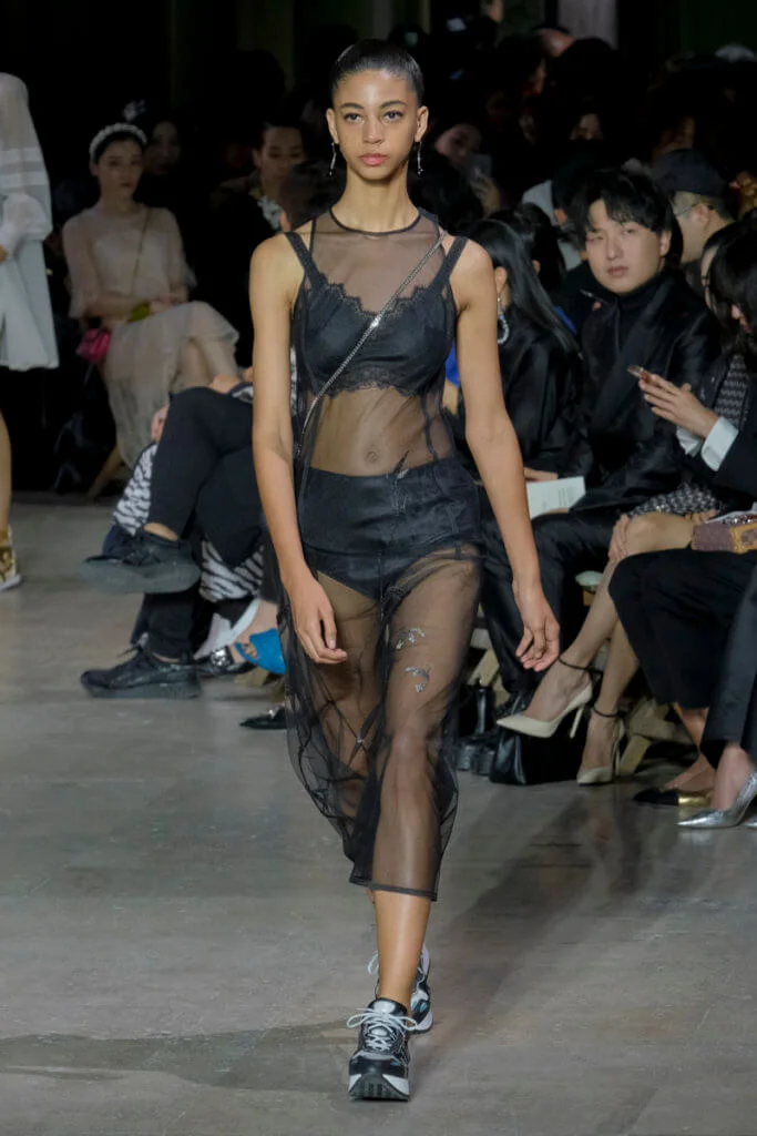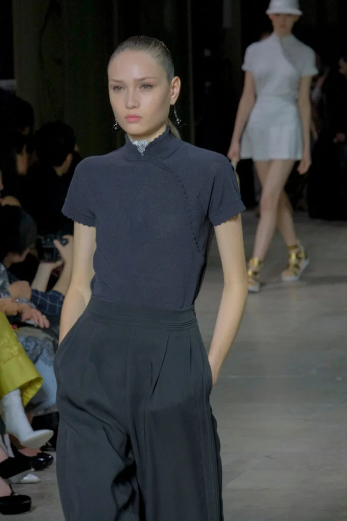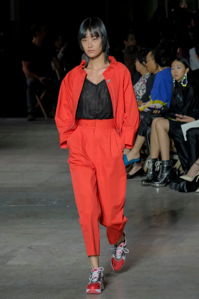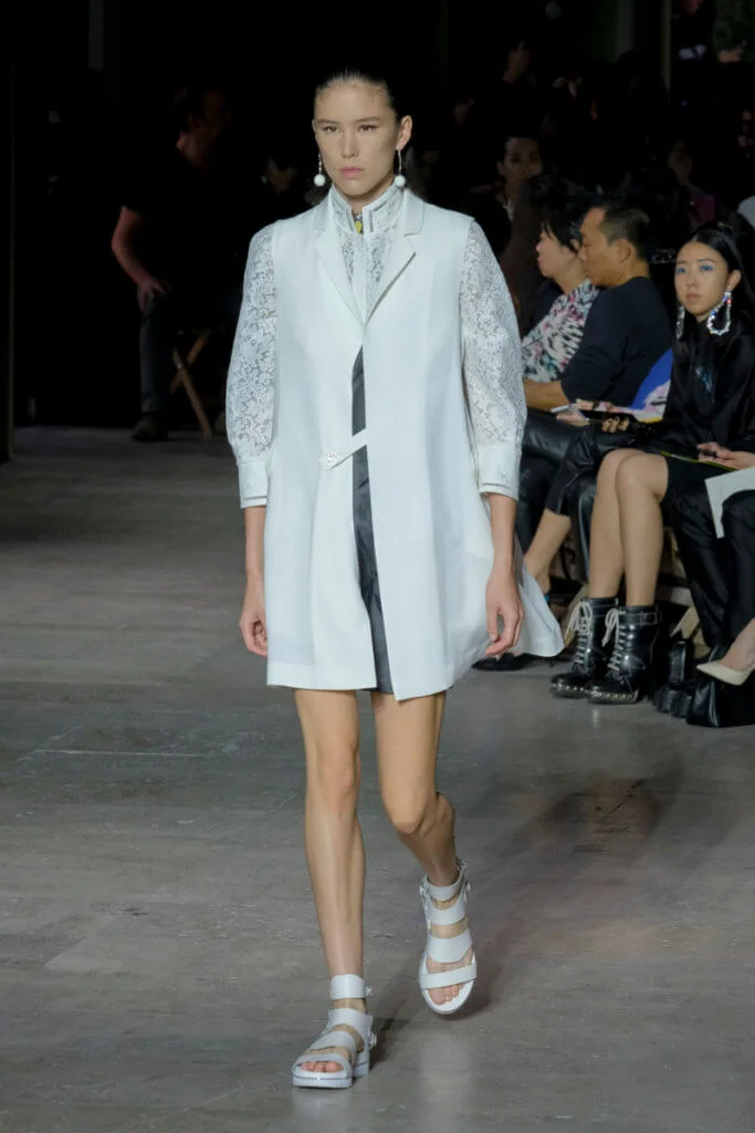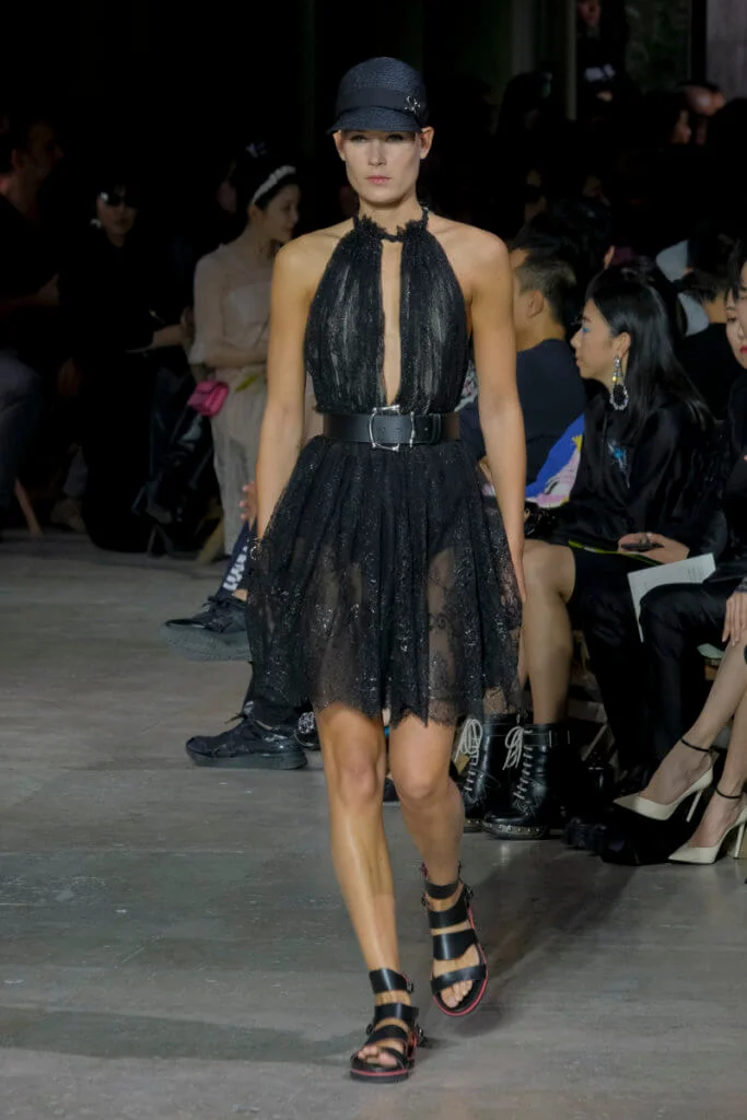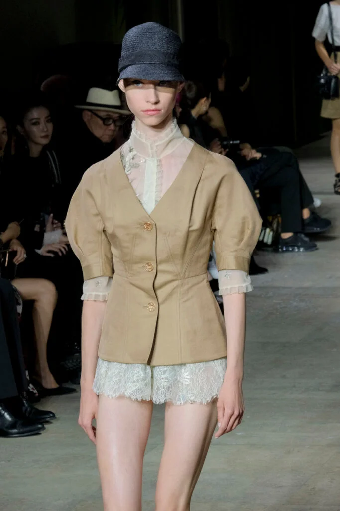 在總長超過千碼的烏干紗林立在會場之中,如置身竹林的蔥綠世界,模特兒行走時輕盈如風,原來,風是可以觸碰的。至於衣服方面,創意總監陳彩霞巧妙地加入蕾絲圖框繡花、肚兜元素,就算短裙和長裙都能夠做到飄逸的效果。最為詩意的是今季以一系列活潑的白描繪圖手法描摹竹林生態的圖騰,如蝴蝶、螳螂、蝸牛,構成一個翠葉竹林的自然景象,輕易展現女性優雅的氣質。坦白說,今年時裝周幾乎每一個品牌都向大自然、森林、綠色時尚致敬;但是SHIATZY CHEN令人欣賞的地方是,品牌從場地到服裝都讓觀眾恍惚走進張藝謀《十面埋伏》的現代版,就算女人穿著多麼性感的裙子,加上一對靈活走動的波鞋,已經能夠在生活的大小時刻鬆容動人,像五千年的歷史洪流,都可以與竹一樣無比堅韌。