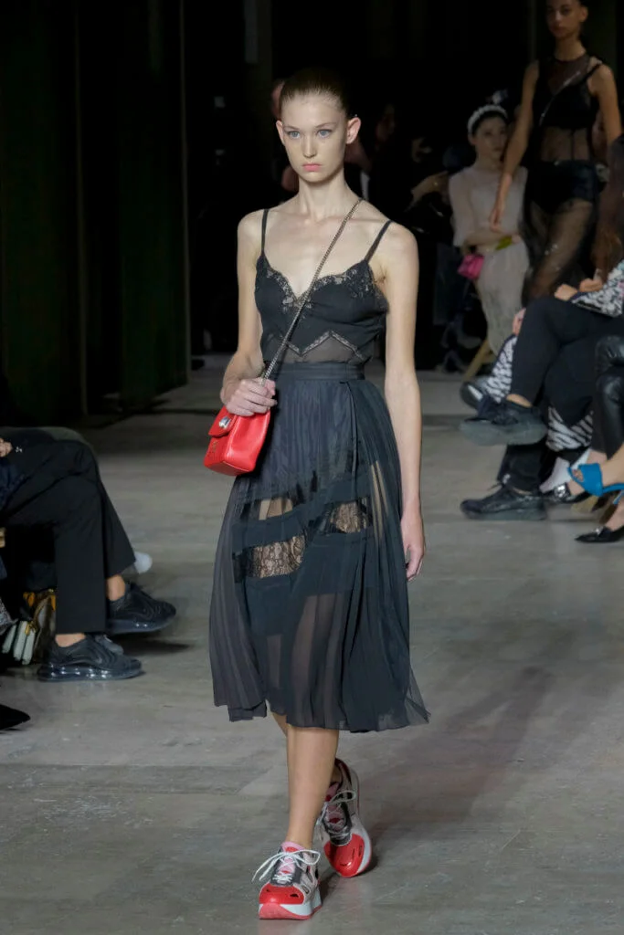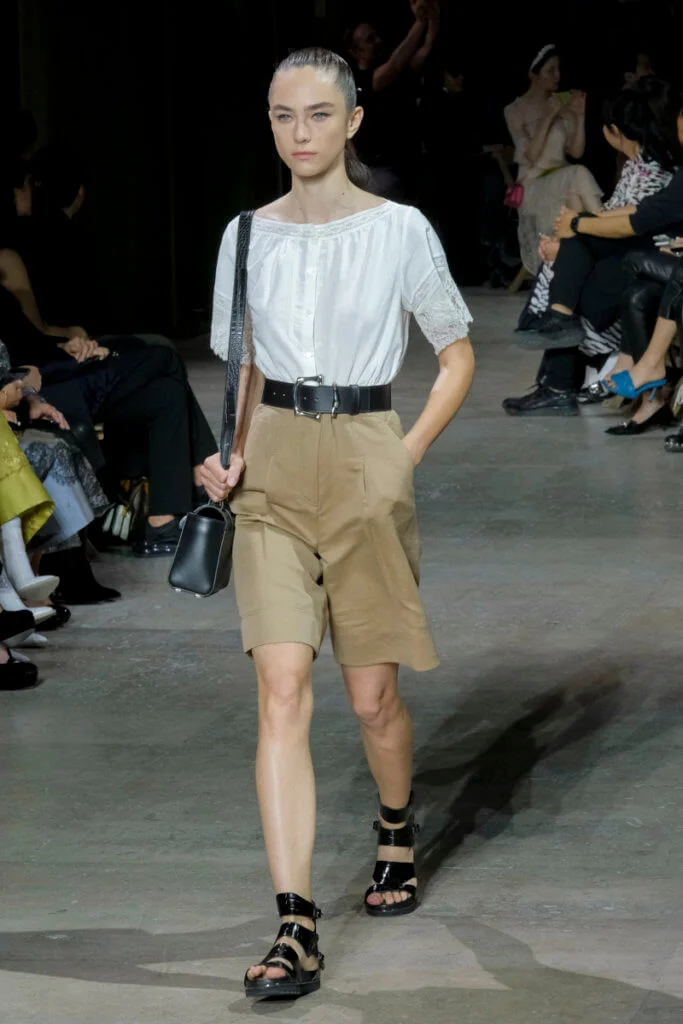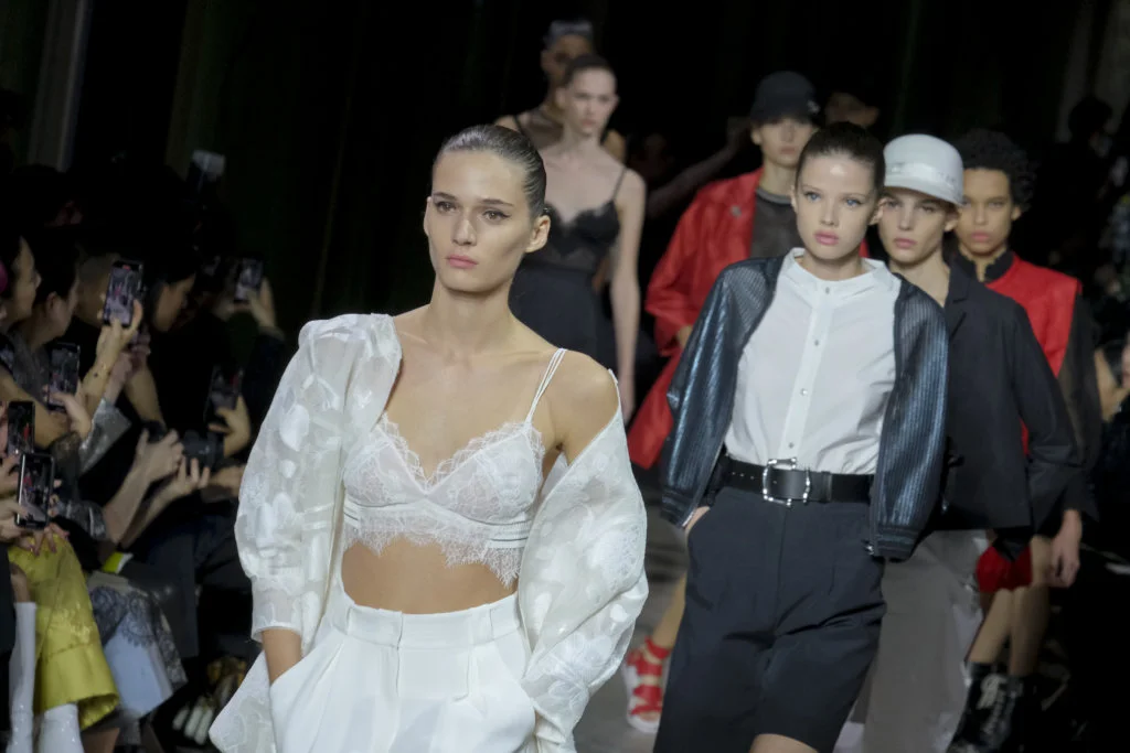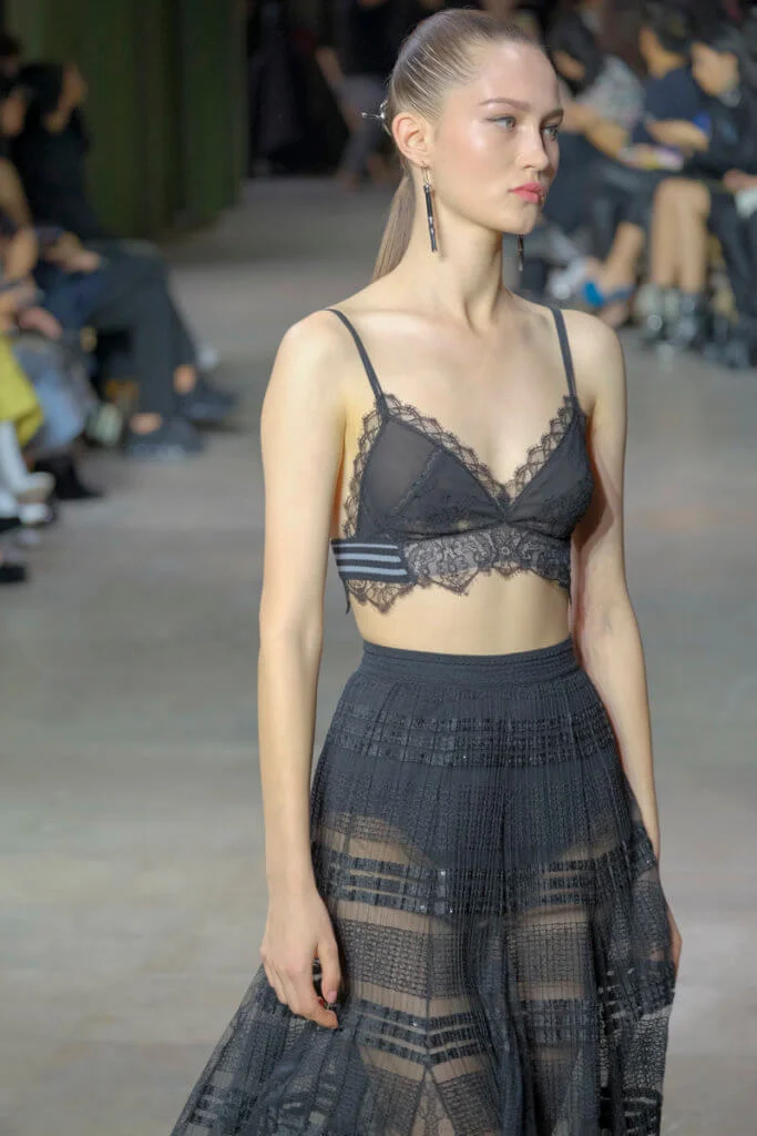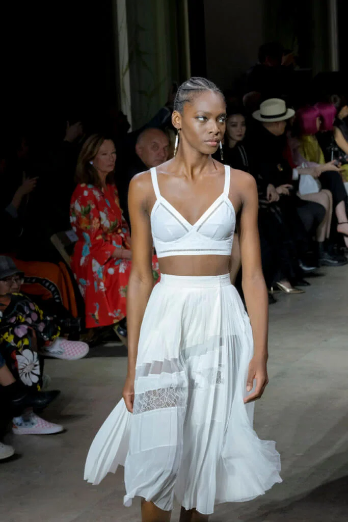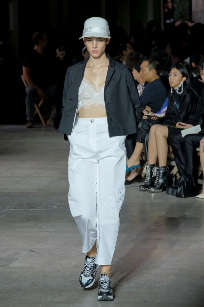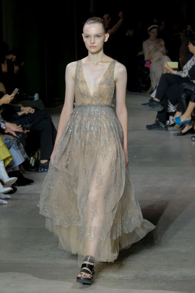 在總長超過千碼的烏干紗林立在會場之中,如置身竹林的蔥綠世界,模特兒行走時輕盈如風,原來,風是可以觸碰的。至於衣服方面,創意總監陳彩霞巧妙地加入蕾絲圖框繡花、肚兜元素,就算短裙和長裙都能夠做到飄逸的效果。最為詩意的是今季以一系列活潑的白描繪圖手法描摹竹林生態的圖騰,如蝴蝶、螳螂、蝸牛,構成一個翠葉竹林的自然景象,輕易展現女性優雅的氣質。坦白說,今年時裝周幾乎每一個品牌都向大自然、森林、綠色時尚致敬;但是SHIATZY CHEN令人欣賞的地方是,品牌從場地到服裝都讓觀眾恍惚走進張藝謀《十面埋伏》的現代版,就算女人穿著多麼性感的裙子,加上一對靈活走動的波鞋,已經能夠在生活的大小時刻鬆容動人,像五千年的歷史洪流,都可以與竹一樣無比堅韌。
