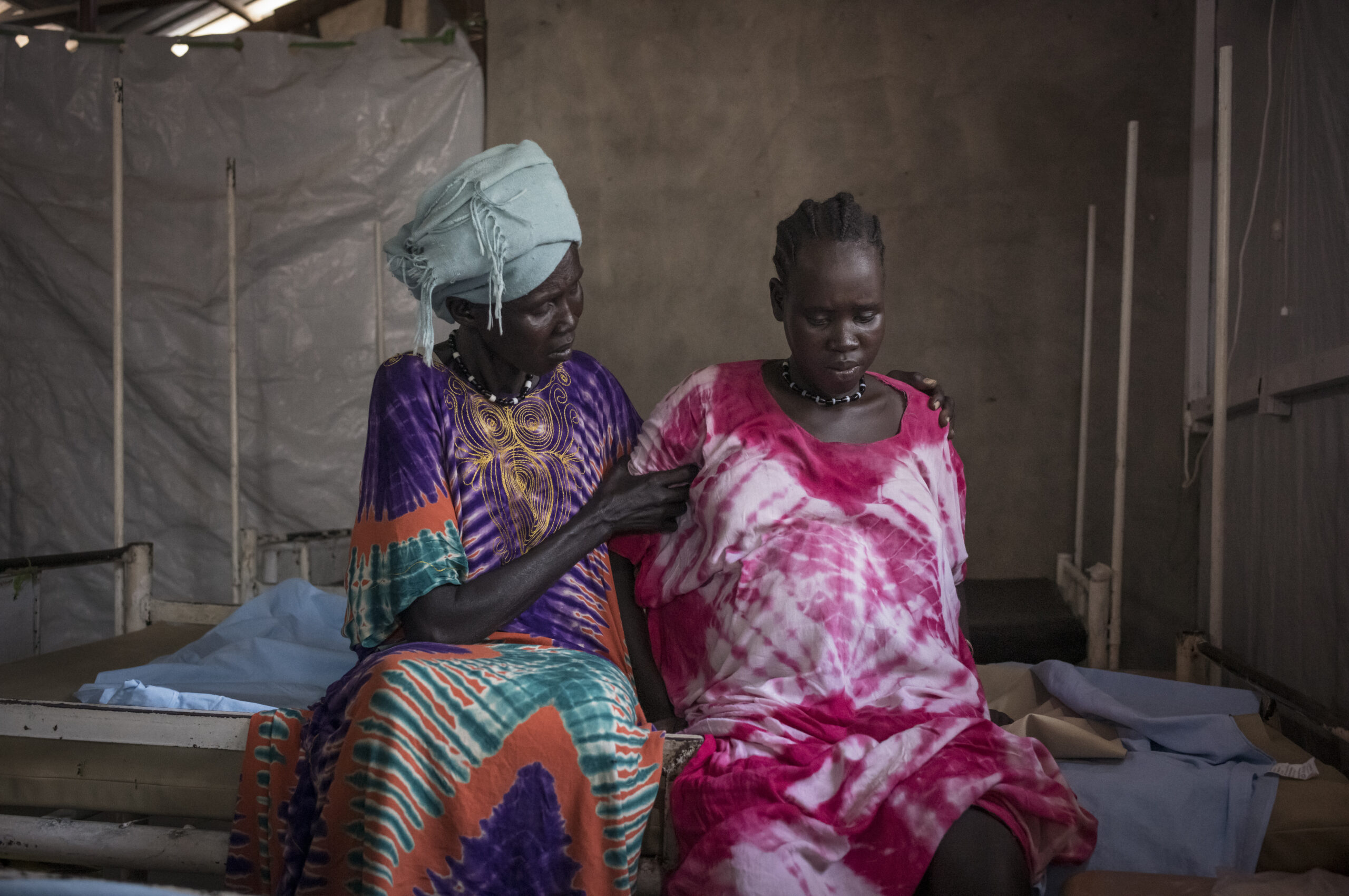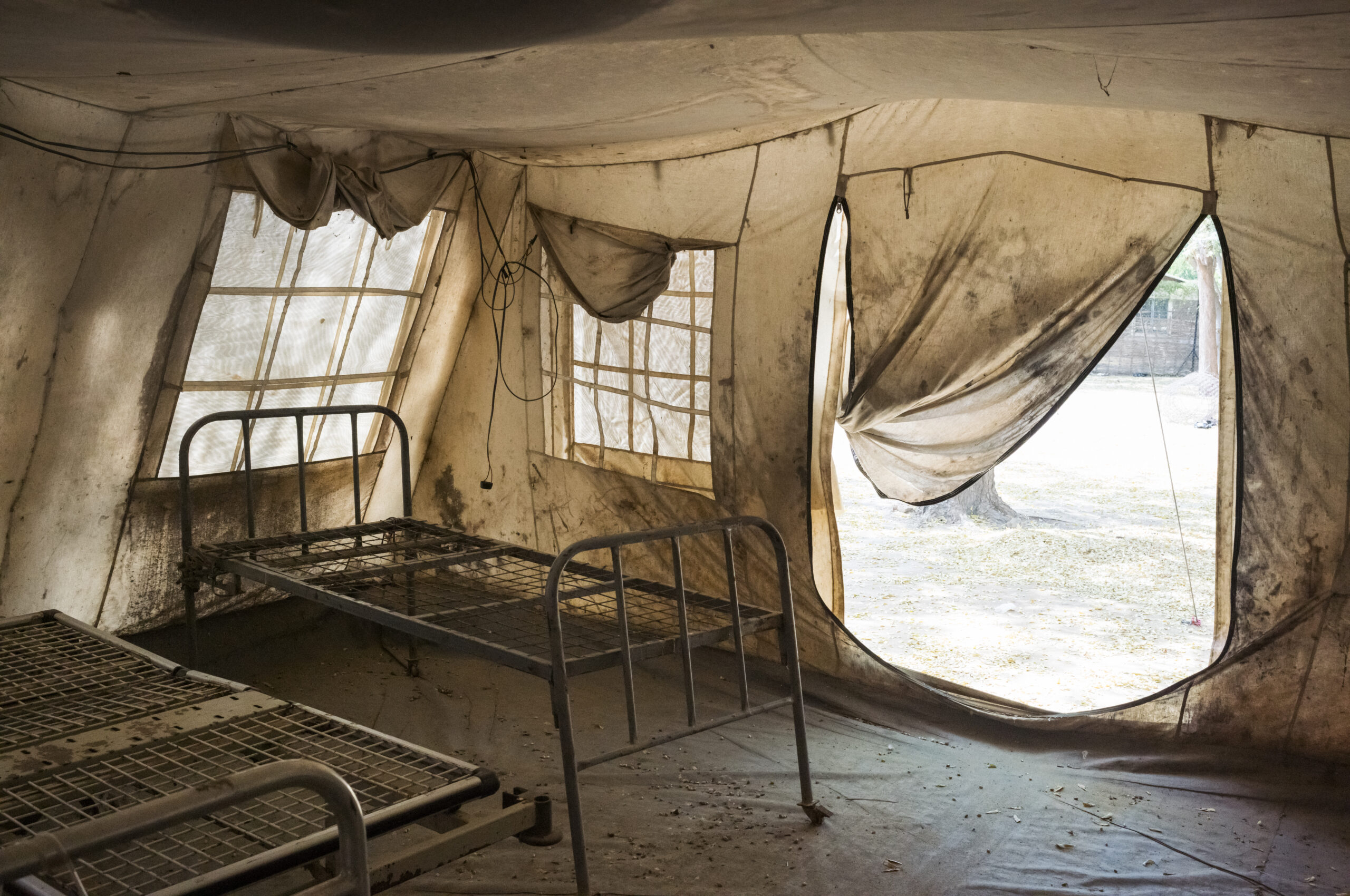 南蘇丹逾八成的基本醫療服務依靠非政府組織的支援運作。然而,國際援助銳減、局勢動盪,加上針對醫療設施的暴力襲擊頻生,迫使不少機構縮減甚至完全停止服務,令本已搖搖欲墜的醫療系統百上加斤。照片中是特維克縣(Twic County)的德蘭修女( Mother Teresa )醫院,帆布帳篷和生鏽病床並排而立;當病人大量湧入時,這裏被用作臨時病房。