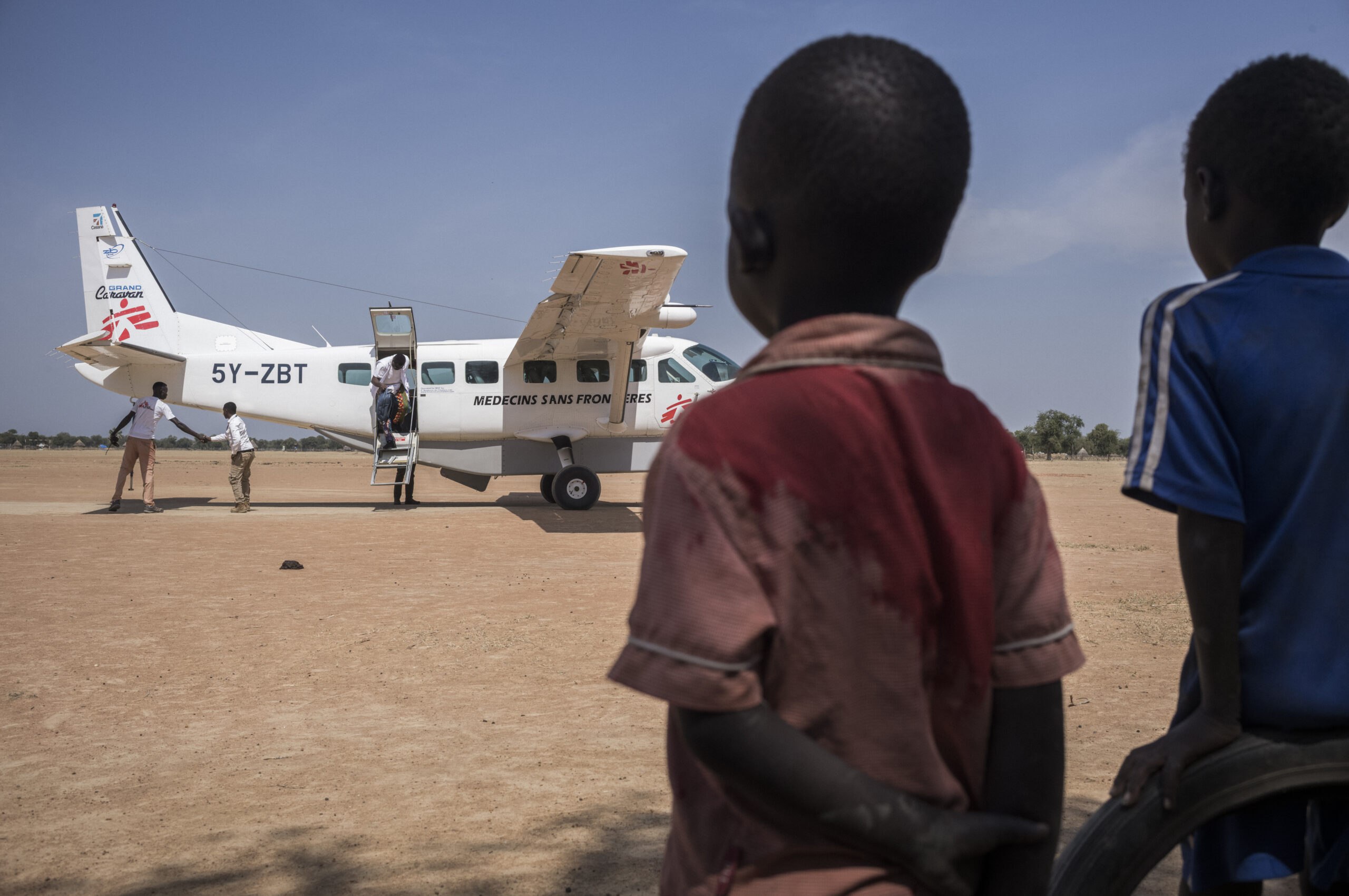在馬延阿本,孩子抬頭看着無國界醫生的飛機降落,卸下救援物資。2025年,無國界醫生在南蘇丹開展了 12 個緊急救援項目,以應對當地霍亂、瘧疾、水災和因暴力引發的難民潮,項目數量比 2024 年高出一倍。儘管無國界醫生持續援助,一些其他原定在當地提供援助的組織,卻因國際援助削減或安全惡化而撤出,令整個醫療系統崩塌,意味一旦病人離開無國界醫生支援的醫院,幾乎就再找不到其他地方可以覆診或尋求治療。