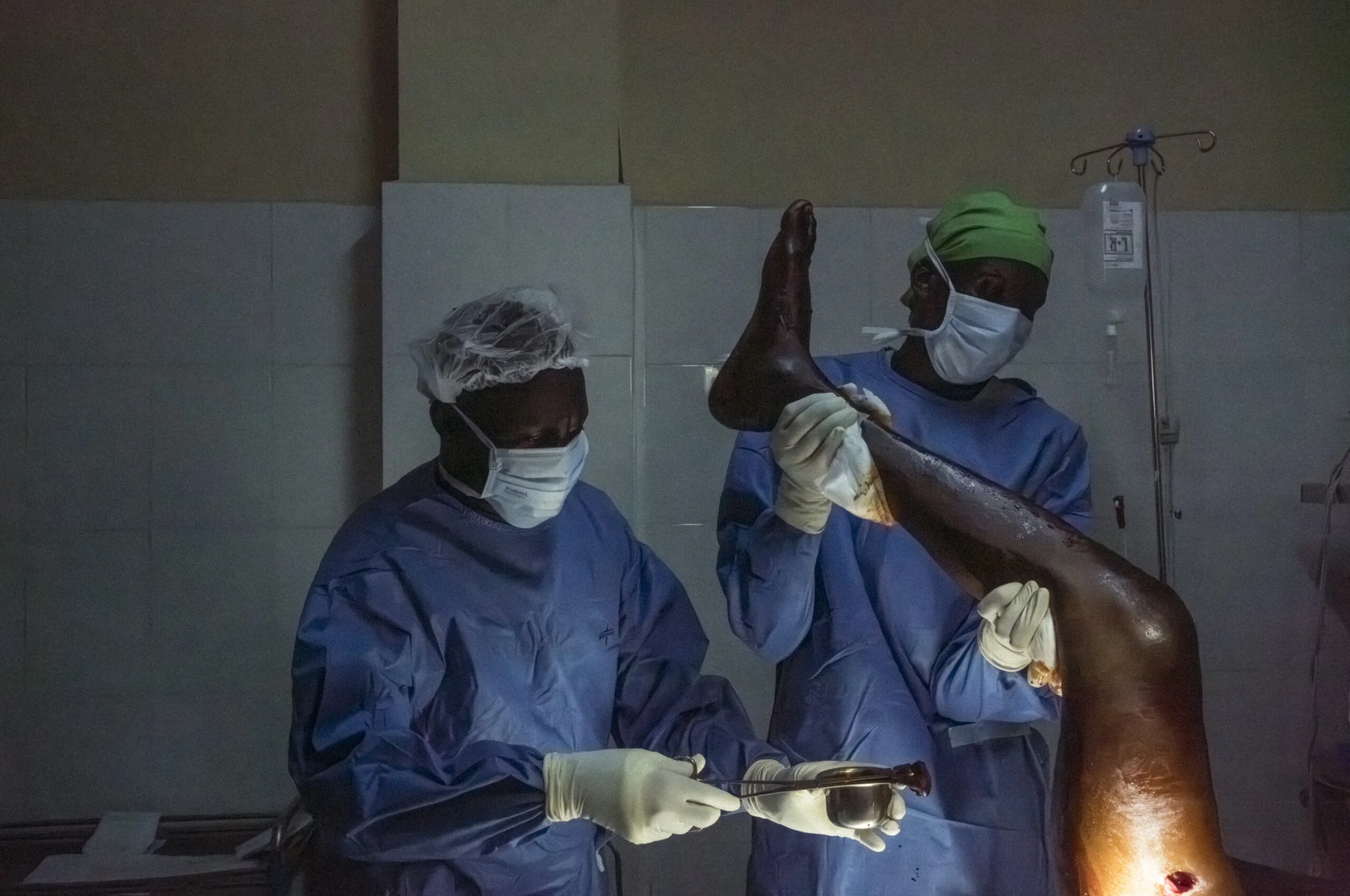 在阿卜耶伊,羅索也見到了許多在逃難途中受傷的平民與士兵。照片中,無國界醫生的醫護人員正為一名因槍傷導致粉碎性骨折的病人施行手術。僅去年一月至九月期間,無國界醫生在當地的醫院已為1,240名病人施行外科手術。