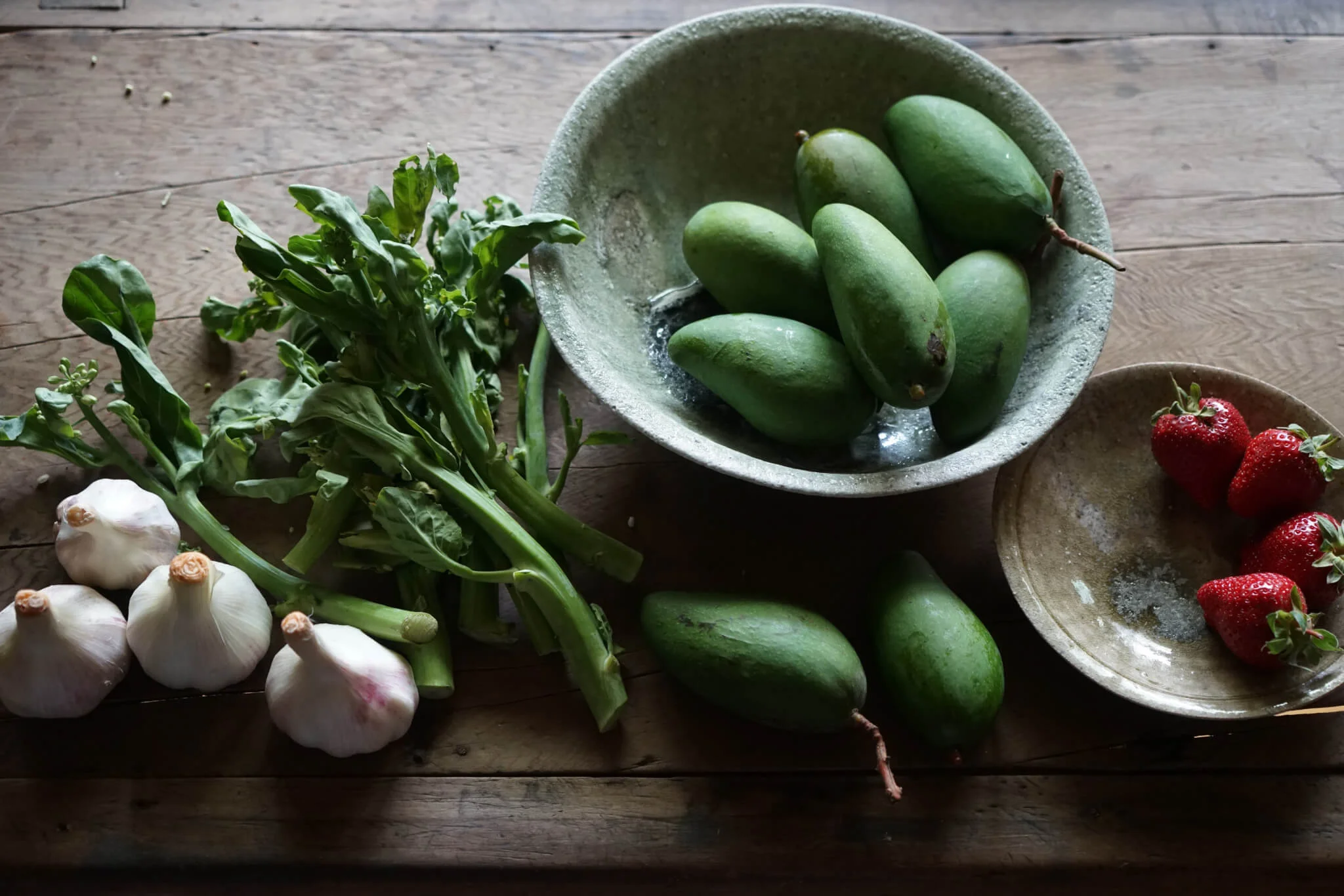 不知道是不是因為這樣,即使只買當天的菜,即使菜漂漂亮亮用不着我打理,我還是習慣一進門,就把它們都從購物袋裏拿出來,換上喜歡的籃子、喜歡的托盤,或者我最珍視的日本陶藝作家作品,慎重其事的擺在自然光下,着迷的盯着它們看。