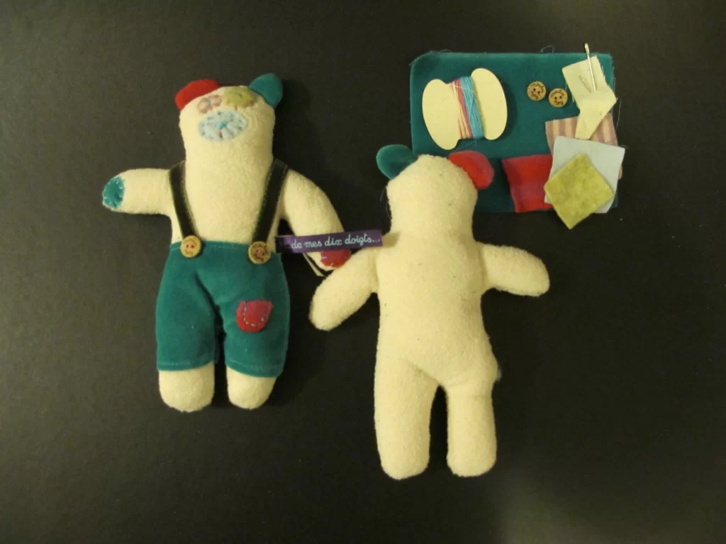 最重要的是布,共有一幅大的綠色絨布,用來給布偶縫褲子。要縫的是吊帶短褲,所以提供兩條漂亮的絲絨緞帶,釘在褲頭上時該用兩顆好看的鈕扣點綴一下,所以,用了圓形的雙孔洞木鈕扣,鈕扣上還刻了Moulin Roty的廠名。褲子正面比較顯眼,背後的鈕扣就免了,只縫上就行。當然,在背後,緞帶要做成交叉形,穿起帶子來就不會從肩膊滑下來。褲子上還可以縫一個小口袋,就更漂亮了。