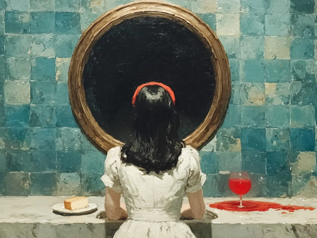那個男人正在陪着一個十來歲的少女在吃蛋糕。我隨手拿起鄰桌還未收拾的一把牛排刀子,鋸齒狀的刅上還沾着血水。我舉起手,下一刻便覺左胸劇痛,低頭一看,發現那把刀已深深地插進自己的心臟。血湧出來,染紅了我半條白色裙子。我衝進洗手間,用力拔出刀子,血水注滿了洗手盆。抬頭一看,鏡子裏卻空空如也,沒半個人影。純白色的洗手台上,躺着一個黑色髮圈,像極一個零字。