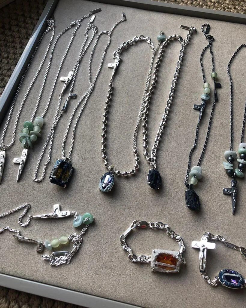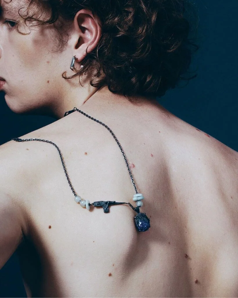 而最吸引筆者的,是SWEETLIMEJUICE如何將以珠寶為媒界,展現著設計可能性。如透過不同石材結合銀器的處理,又或以(經過漂色)的丹寧物料作為設計元素,用它包裹著石材邊緣,呈現如同漸變效果,同時也令每件飾物都有著獨一無二的外形,男女佳宜。