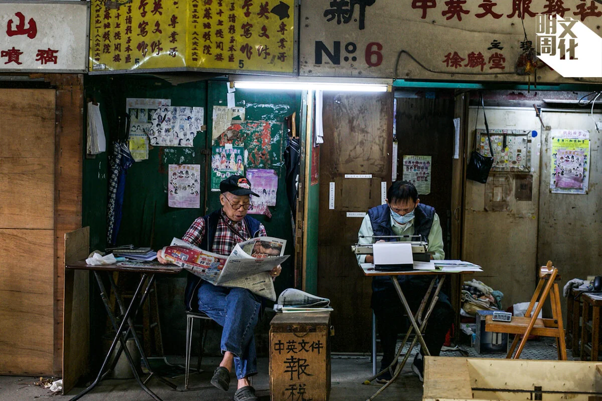 新玉器市場看上光猛明亮,不少檔主已經開始營業,但是人流似乎與之前同樣冷清。正值搬遷前夕,舊玉器市場只餘下寮寮數檔仍在營業,人流疏落之中,也見外籍人士到訪,試戴耳環。部分檔主把握最後時間清理攤位,但是寫信檔前有一位檔主仍在舊式打字機前埋頭苦幹。旁邊坐着一位不知道是街坊還是東童,悠然自得地閱報。