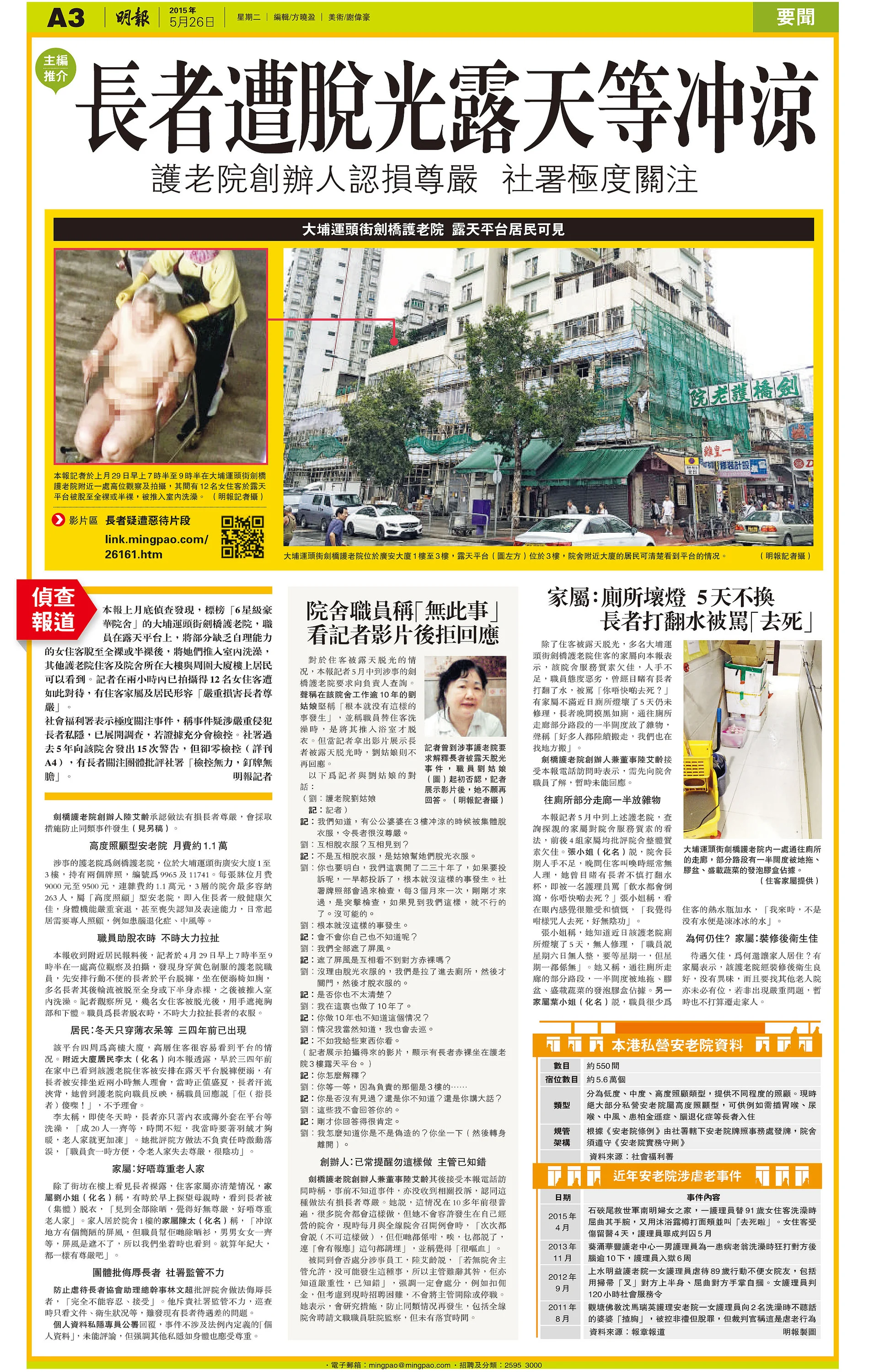 二◯一五年,《明報》偵查組揭發大埔廣福道劍橋護老院於寒冬將院友推到平台並脫衣沖涼,五月二十六日刊出獨家新聞。頭版以「院友遭露天脫光」大字凸顯事情粗暴,赤裸的老人隔着一重馬賽克無聲攤坐輪椅上的照片,成為有力佐證。報導一出,全城譁然。當年記者乘勝追擊,連日以更多版面跟進,層層揭露更多違規及監管問題。