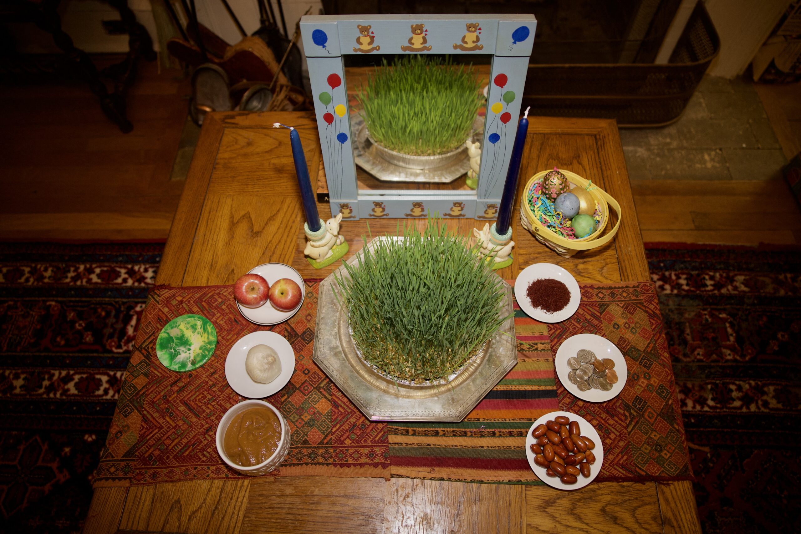 在美國生活了三年的一名伊朗人在家中擺放着一張Haft-Sin桌。(Photo by Amid FARAHI / AFP)