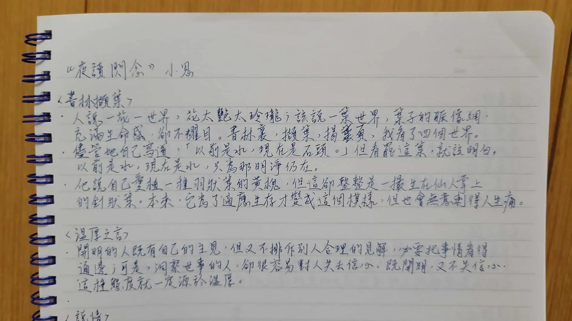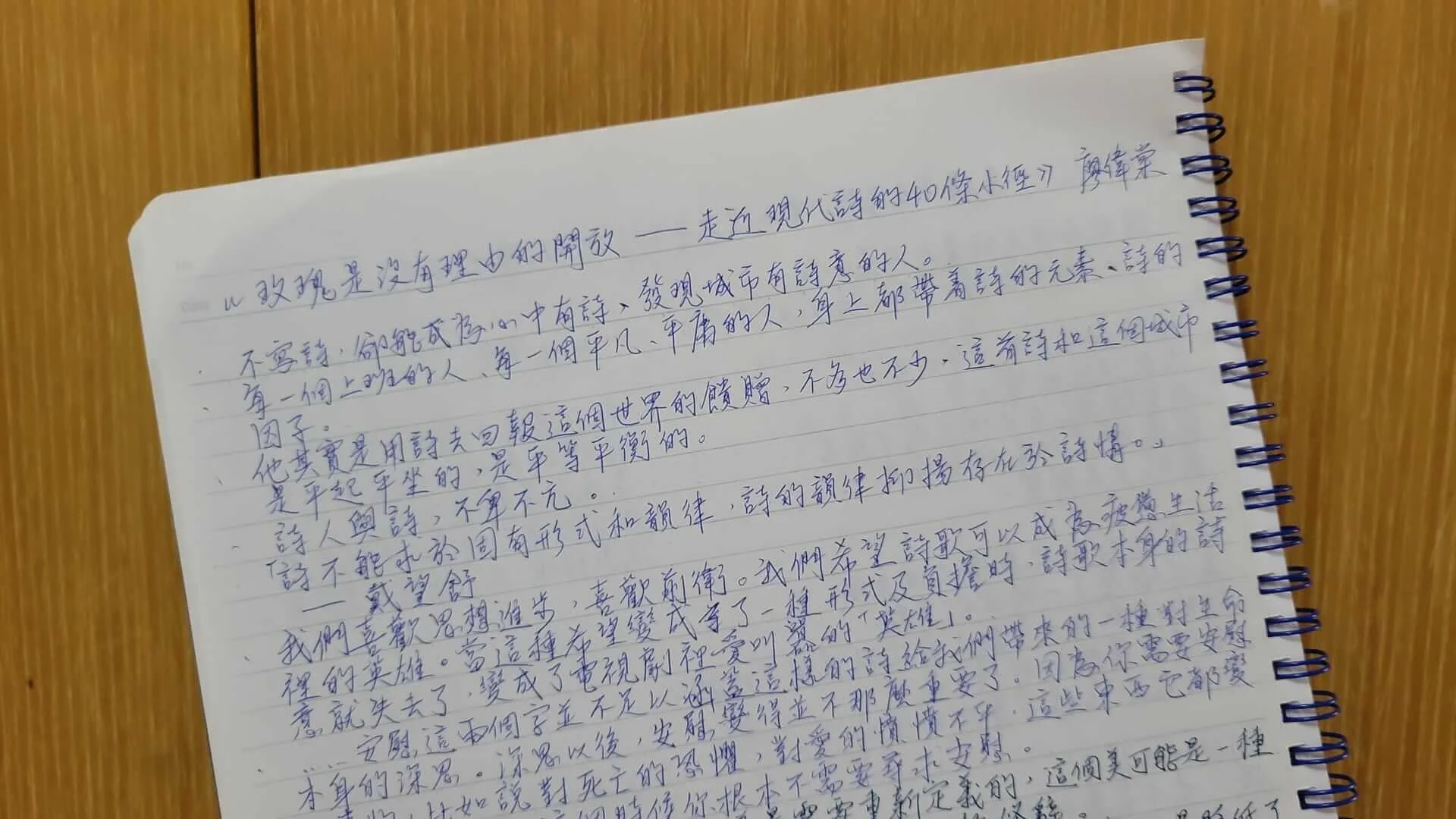 長大後,Eliza喜歡閱讀新詩、散文和小說,尤其喜愛古典文學,她笑稱自己喜愛閱讀的書籍與同齡人不同,但她卻能從無特定格律要求的新詩中,尋覓自由的快感和無限的想像,「讀書不只是單方面吸收,而是要先經思考,而思考的過程可以令自己思想變得活躍、對抗舊嘅自己。」因此,每讀畢一本書,她總會特意用筆記本記下讀後感和有意思的句子。