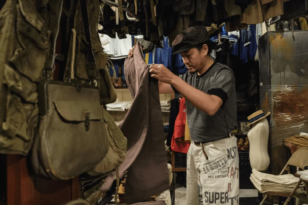 古著店Luddite的店門上掛了一台舊式沉實的黑單車,門口則放置了斑駁的木椅,滿滿的歲月痕跡。推開木門,像是跌入更古舊的時空。店裏放滿了林林總總的古著,這邊是英軍軍鞋、德軍褲,那邊掛着以舊布拼成的和服,一隅的木枱還擺放了店主Rex設計的啹喀兵褲與衣品。