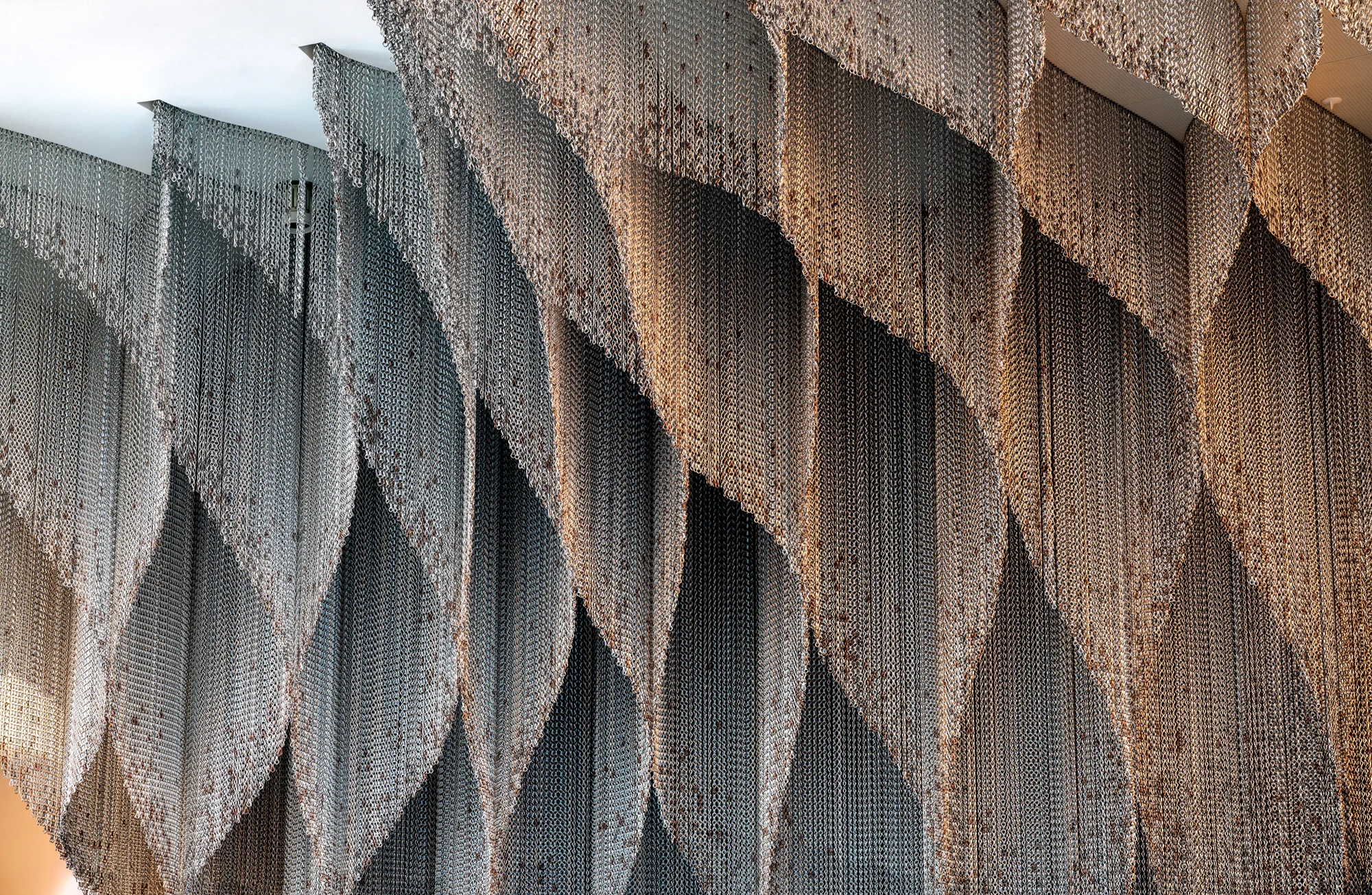 由隈研吾操刀的鋁製垂簾裝置位於樓梯兩旁和天花板,銀色的鋁簾如波浪一層疊一層,富有動感,從上而下看,鋁片的顏色由淺變深,愈接近地下室舊煤倉的空間,愈貼近灰黑色,如像由明亮的天空轉移至深沉的地下室。建築師解釋:「我們想像這個空間穿著鋁製的窗簾,它們以細緻的材質捕捉光線,就像漁網一樣,以各種形式向我們展示光:亮度、輪廓、陰影。通過省略任何其他材料,並使用這些鏈條把樓梯隱藏其中,我們便能夠只談論光本身。」