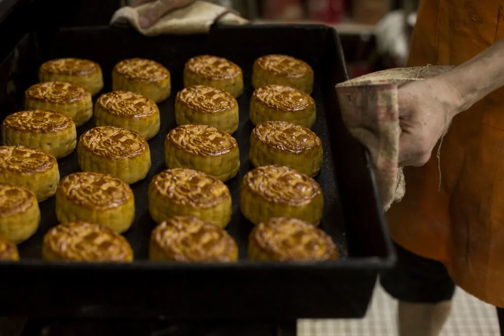 弟弟阿宗負責餅皮包裹,見他技藝純熟的把餅皮包住餡料打圈捏捏捏,「機器壓模的月餅,都把過剩的餅皮壓到餅底去,餅厚度不均自然不好吃;而用人手,我可以掌控每個餅皮的厚薄度,這便是手工月餅價值的所在。」一個搓餡,一個敲餅,兩兄弟之間縱然沒太多的言語,但彼此一個承接的動作已盡顯默契。「餅已焗得透焗得靚,需要不時開爐轉動餅盤,保持火力均勻就不會焗過了頭。」焗餅才不過半小時,但阿榮每分每秒卻心繫爐裏的成果。