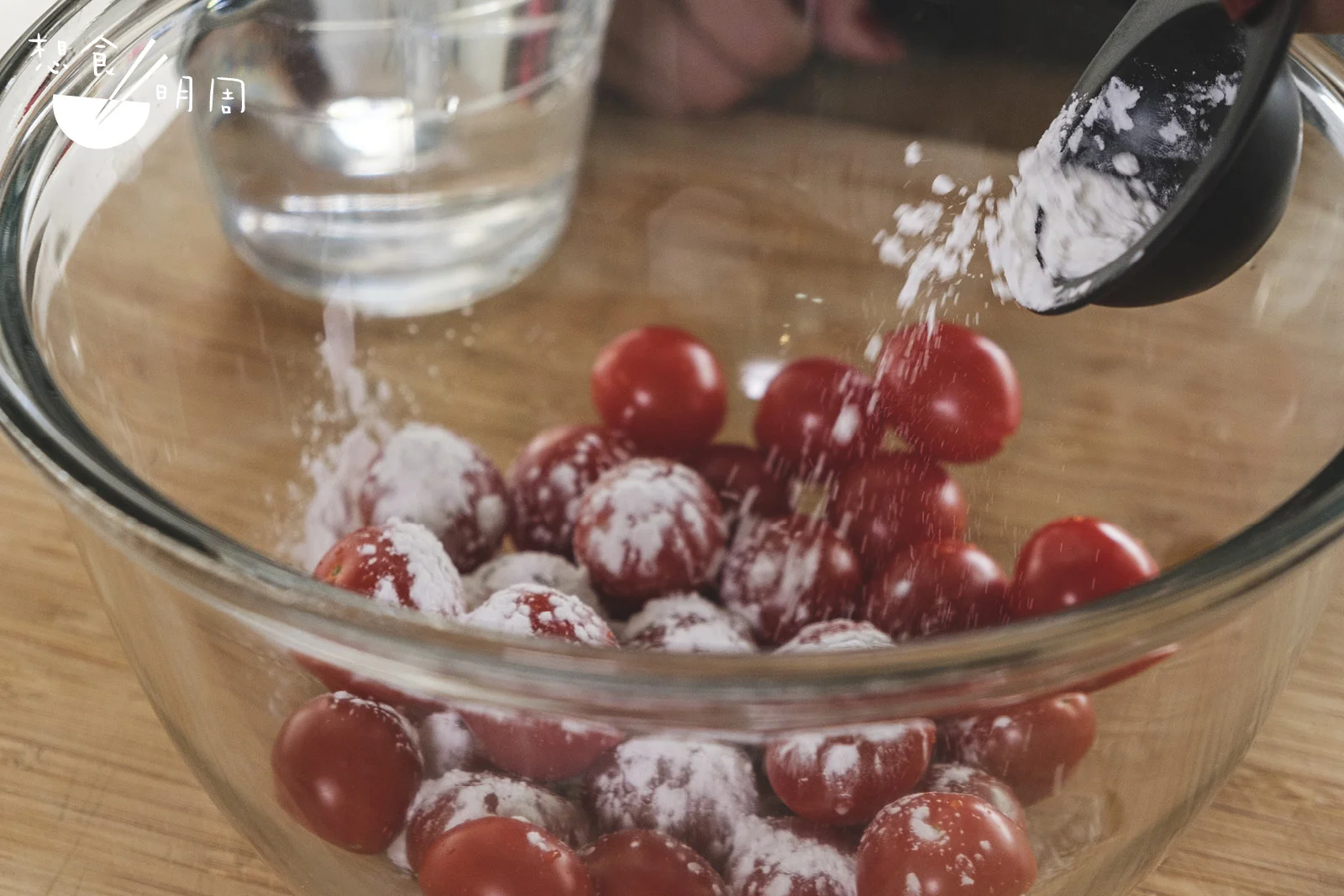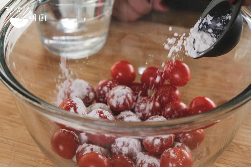 1. 櫻桃番茄一湯匙粟粉洗乾淨,切去頂部及在中間輕輕𠝹一刀(不要切太深 / 切斷),備用。