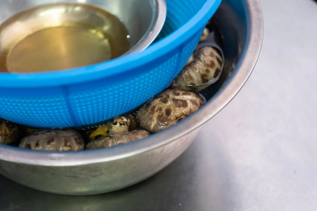 買了對的冬菇,還得使用對的方法泡水,將內裏的香菇香精還原,鮮味才能放到最大。浸泡時的用水溫度至為關鍵,宜使用25–35℃的室溫水,絕不能貪快用熱水,不然便殺死冬菇的鳥苷酸,鮮味盡失。冬菇浸泡約四小時後,也需如洗海綿似的,用力揸乾冬菇內的水分。這些啡啡黃黃的水,吸收過冬菇的香氣,也帶有點點泥土氣息。很多長輩都會特意把它留起,隔走沉澱,留待蒸肉餅或煲湯時才加進去,讓菜式菇味更幽香。至於剪去不用的蒂頭,其實也可以循環再用,例如可熬製鮮甜的素高湯,或者製作香菇貢丸。