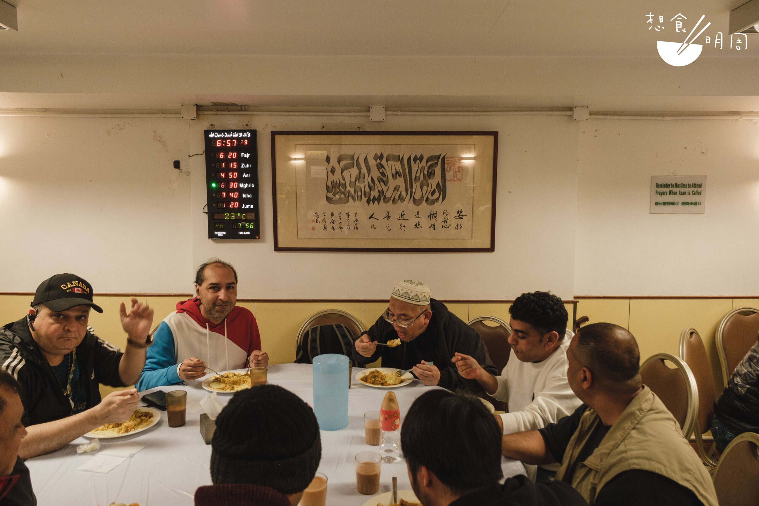 在灣仔愛群清真寺,許多印巴裔一家大小一起吃開齋飯。