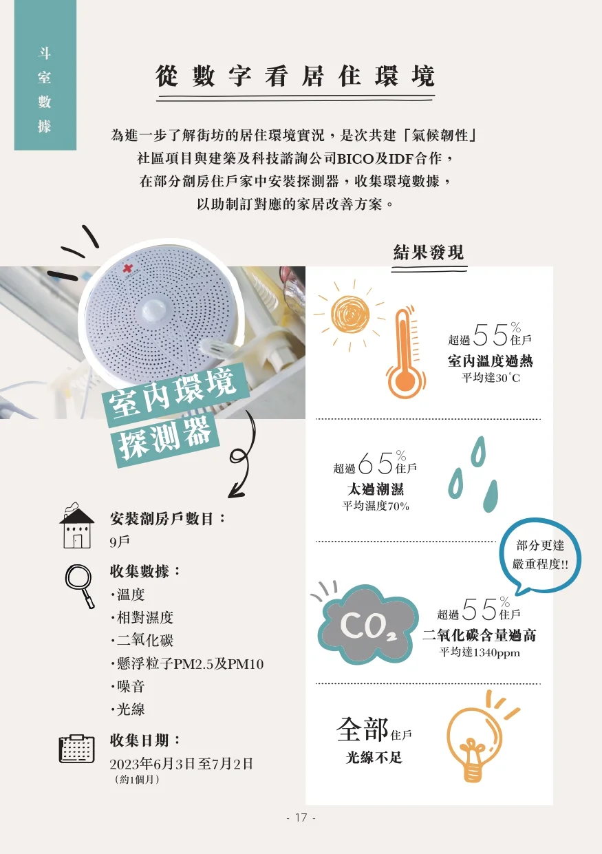 為深入了解「不適切房屋」的具體環境,香港紅十字會於今年6及11月,在29個劏房戶家中安裝環境感應器,收集溫度、相對濕度、二氧化碳、噪音、空氣質素和光線水平各種數據。