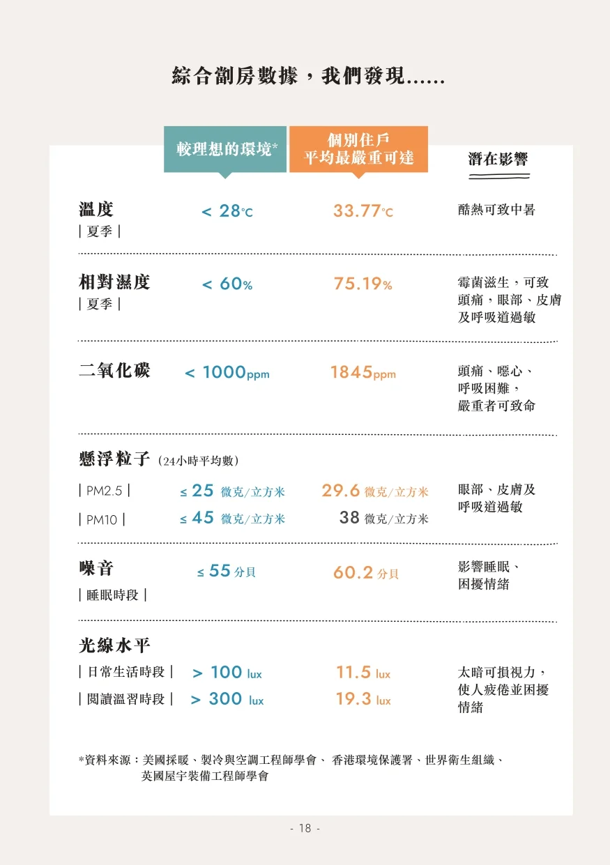 居住環境惡劣,直接影響住戶的身心健康:溫度過高固然難受;濕度過高會滋生霉菌,造成皮膚及呼吸道問題;二氣化碳濃度過高可能引致頭痛、噁心、呼吸困難等問題;而光線不足會損害視力,使人疲倦並影響情緒。