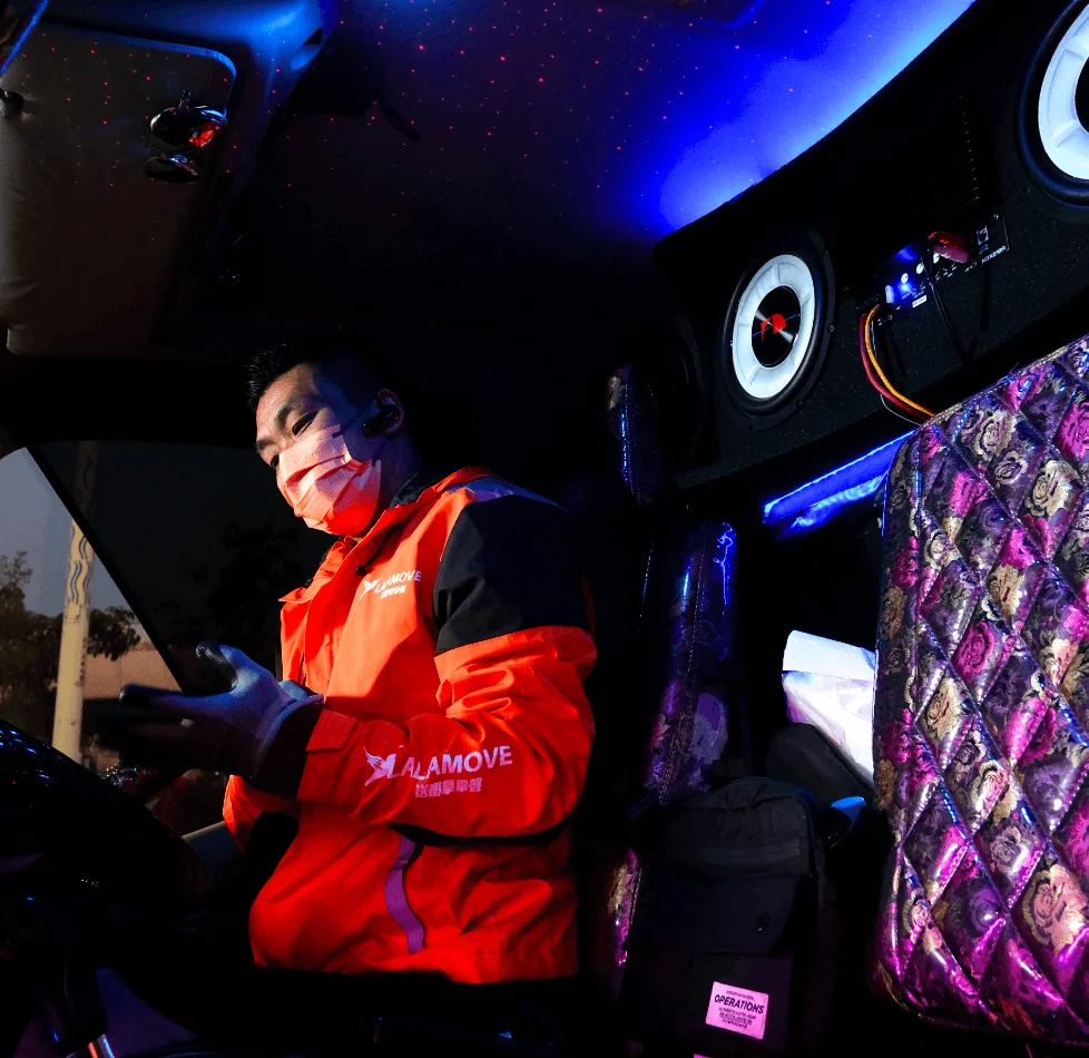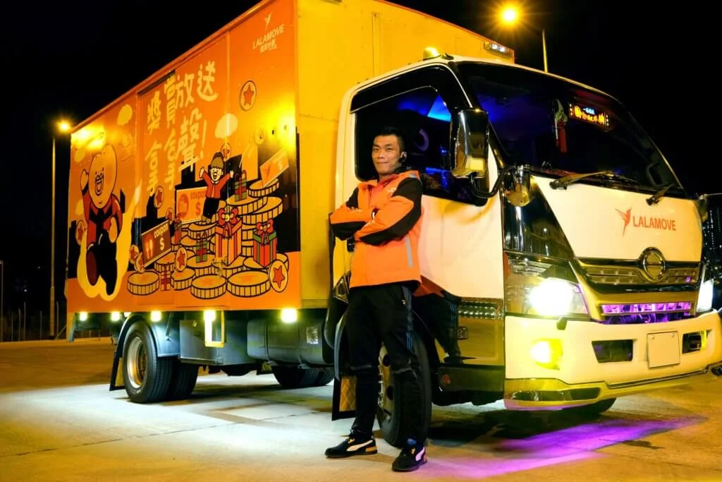熱愛司機一職,對車的熱愛也是一大原因。輝哥對貨車的燈光設計特別有興趣,除了車廂內的燈光、音響、燈箱外,亦配置熒光紫燈帶,車身、輪殼都加上LED燈。一系列「型格」裝置外,車身卻有可愛的 Lalamove 藝術貼紙,「車的外形本來是黃色的,既然都打算翻新,不如就貼 Lalamove 車貼吧!」輝哥加入 Lalamove 約有八年,他得知 Lalamove 為司機夥伴提供優惠獎賞,貼上車貼的司機夥伴可得到廣告費,更可享有接單優勢。