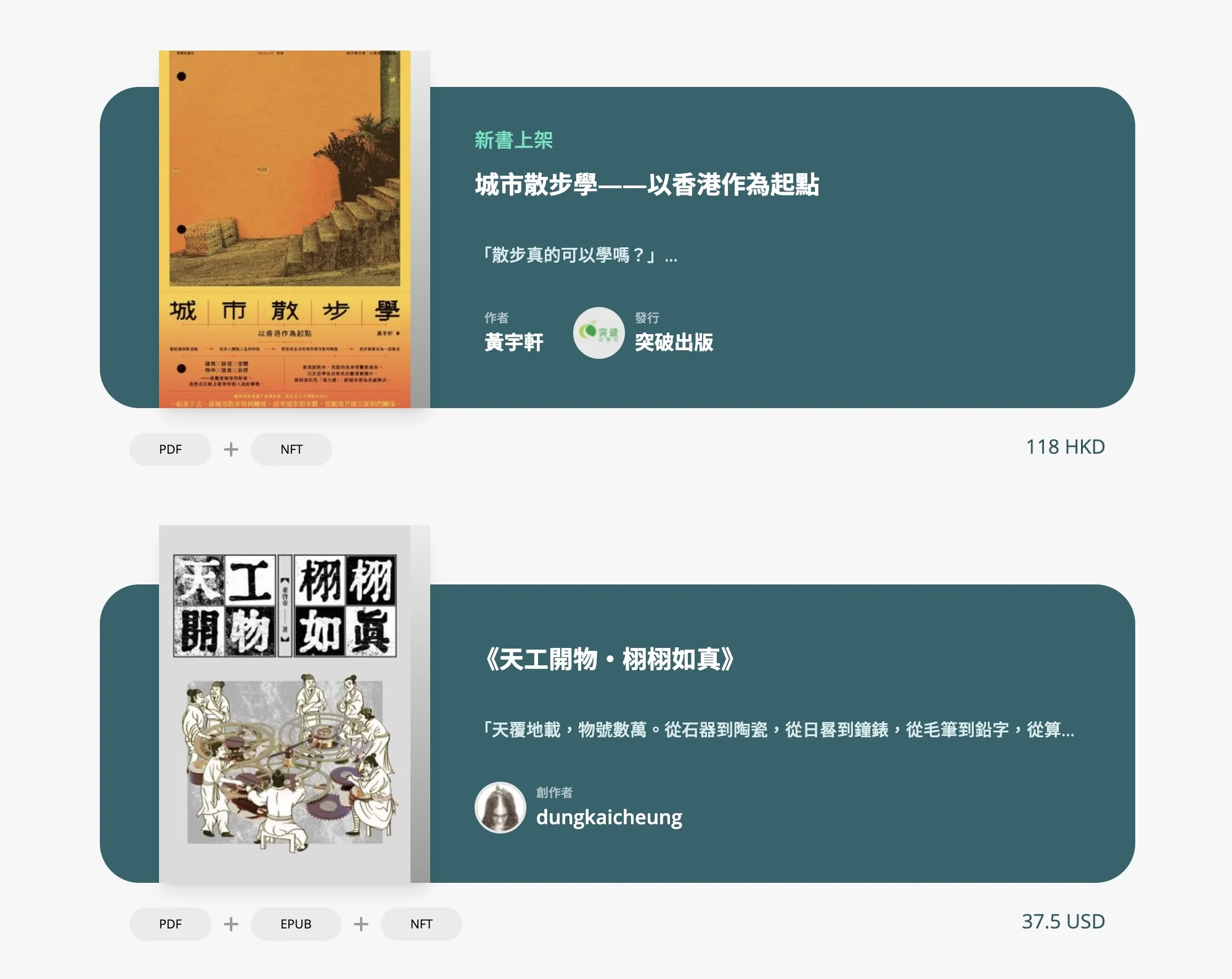 我不是把責任完全推在出版社身上。事實上有不少良心出版社在惡劣的經營環境中苦苦掙扎。在書市低迷、成本高昂和日漸僵化的產業結構下,不只作者,連出版社和書店(特別是小規模的獨立經營者)都陷入生存險境。在有限的回報下,互相爭奪分成多少完全沒有意義。但是,如果有一種出版方式,可以給予作者高度自主,無需依賴出版社和書店的代理,由製作到銷售完全DIY,他便可以獲得極高成數的利潤。NFT書就是這樣的一種出版技術。