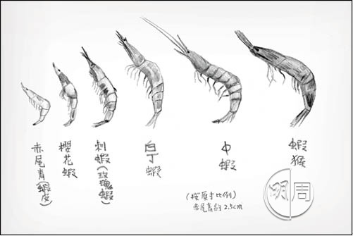 我不斷探問當地船長和老漁夫,為何叫赤尾青。他們說不出所以然。最後乾脆都說反正以前的人這樣叫,便如此稱呼,無從考證。但若照一些網路魚類資訊核對,顧名思義當可推知。此種蝦類的尾部具有類似星狀的紅色斑點,故漁民以赤尾青(星)稱之。牠在不遠的旗津又有另一名字,臭青。林園地區則以草尾星蝦稱呼。整體論之,牠是產於沿海河口的小型浮游性蝦類,在台灣因地而有異名。