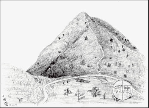 「入口處既無地圖亦無布條,一路狐疑上行。約莫二十分鐘後,抵達了昂坪的交岔口。眼前循稜線望去,赫然矗立着大金鐘山。岔路口,一對登山的年輕情侶正在休息。探問後,確定那路往馬鞍山,他們正要前往。因人生地不熟,不禁再徵詢,自己是否可尾隨。他們欣然歡迎。於是,休息一陣,便雀躍地踏上乾旱而視野開闊的稜線。印象中所謂的香港郊野山稜,終於在摸了許久之後,於焉展開。我開始有一種認識香港大山的興奮。只可惜那種快樂,只有自己能體會,別人恐怕還不懂,我在高興什麼。」