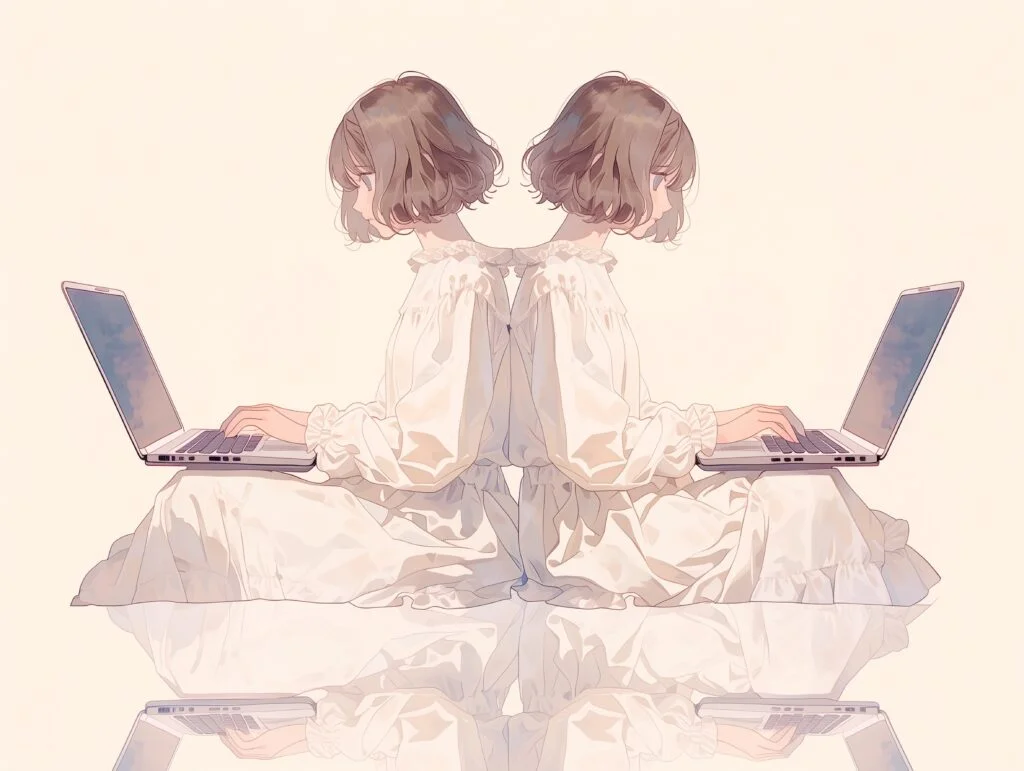 在鏡子裏, 我看見了自己的倒影。鏡中的倒影向我微笑。下一瞬間,屏幕恢復成全白的頁面,只有游標在左上角閃爍。