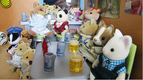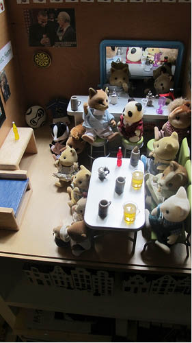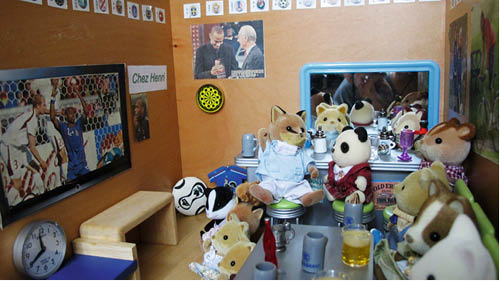 這個緣故,我後來也偶然看看英超的轉播,更追看過好幾屆的世界盃。最近有人問我,還有沒有看足球轉播,我說沒有了,因為眼睛不好,精神不足,也不能夜睡。不過我還留下一個看足球轉播的微型屋,一個我稱為「亨利吧」的盒子房間。「盒子房間」(room box), 即是說,只需要一個盒子就行,不論是木箱、帽盒、鞋盒、各種紙盒,只要是有天花、地板、四面牆就行,實際上三面牆加上地板已經足夠。具備了那樣的空間就可以隨意佈置,選擇內容。恰巧那一年,看足球看得不亦樂乎,又是世界盃,又是英超,好多家餐廳在店內安裝特大的電視屏幕,天天直播,非常熱鬧,我的酒吧也一點一點地成形。貼牆先放一面大鏡子,前面是吧台,台上放瓶子和杯子。英超看多了,喜歡阿仙奴許多球星,就選亨利為主角,牆上貼幾幅亨利的生活圖片,包括亨利和孩子一起騎單車。酒吧內當然有大屏幕,時鐘,擲飛鏢遊戲,三面牆上特別貼上世界盃各國的國旗。這餐廳就叫「亨利吧」。誰來看比賽?森林裏的小動物坐得滿滿的,男女老幼,地方不大,要坐在地上哩。數數看,狐狸、浣熊、兔子、白貓、刺猬等。那次的世界盃是哪一年?就是施丹受辱那年。