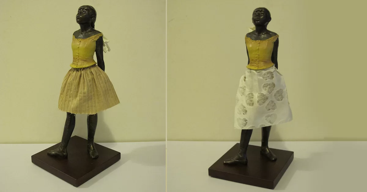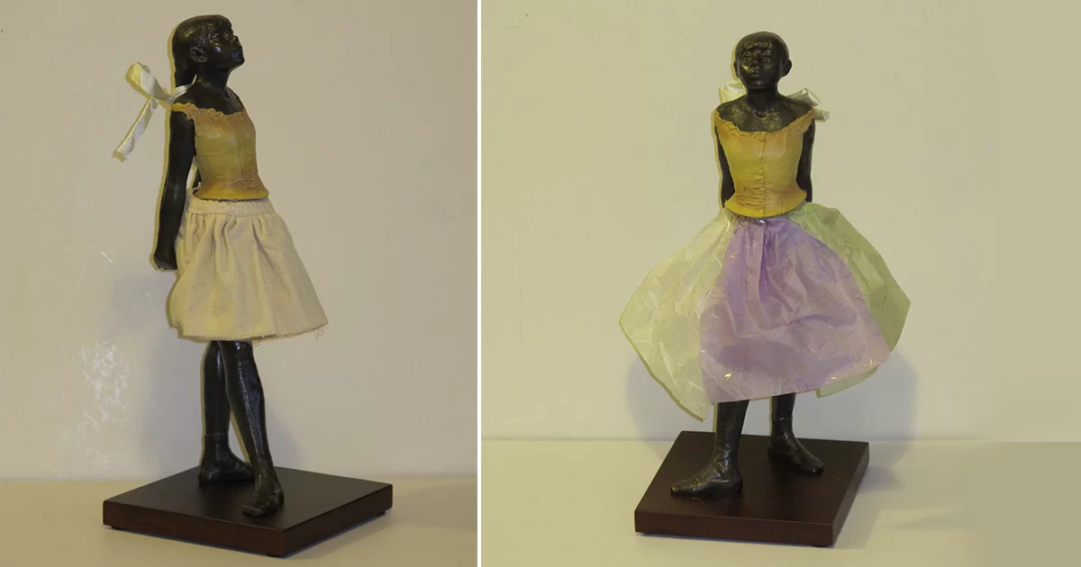 我見到這位少女舞者次次不同的展出。和1881年的原作比,雕像的頭髮和舞鞋都是雕刻出來了,而裙子則是真的紗裙、緞裙、錦布裙,裙子次次不一樣。不同的還有裙子的長度、顏色和款式。當然,最原始的版本仍藏在巴黎奧賽美術館,這一座穿上米白色蓬蓬裙。她梳一條麻花卷粗辮子,結髮的緞帶也次次不同色。從十九世紀以來,雕像可以不變,布質的裙難免被蟲蛀被氧化被灰塵侵佔,所以不得不換上新裙子了。但為什麼不雕刻舞裙呢,大衞要是穿上真實的布褲子,恐怕也要不斷替換了。事實上,廣告商就不斷替大衞設計各種牛仔褲呢。迪加這種拼貼手法,在文學上已不罕見,在雕塑上卻是創新。