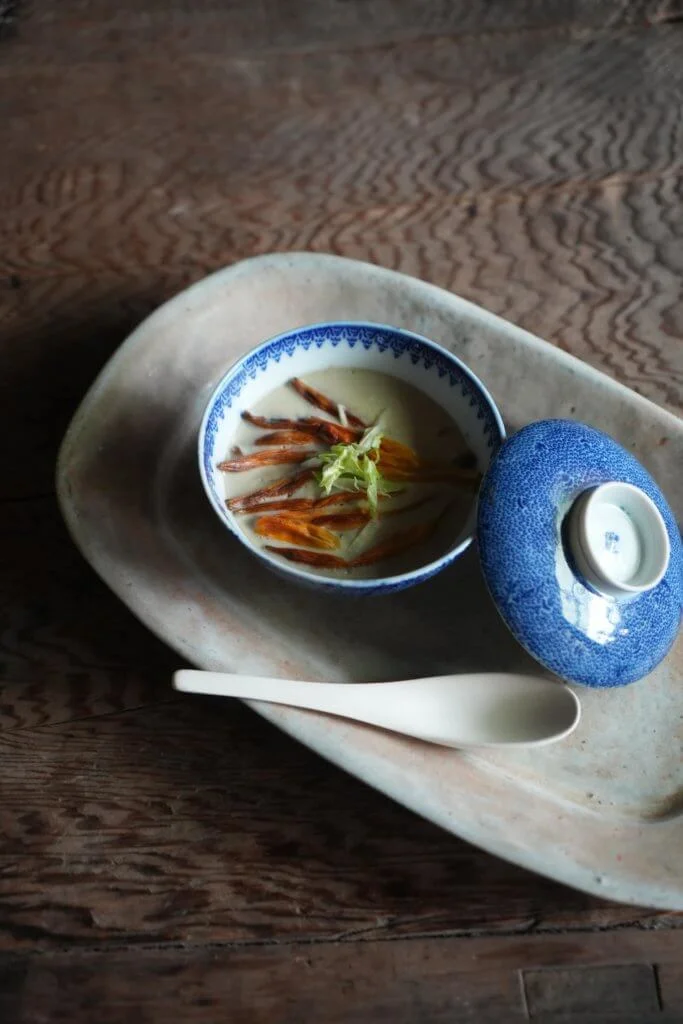 愛逞強,其實一時又想不到要和什麼搭配好。金針花的糖香、細微的酸感,稍縱即逝,很容易被個性強的食材蓋過去。要蠻仔細斟酌,否則就白費了那番古法烘焙的心意。我很確定,它只能和溫柔的食材在一起。