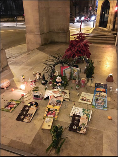 懶得七葷八素,連《星球大戰》外傳也尚未去看,長此以往不是辦法,聖誕後催促自己進戲院。散場後回家途中繞過奧迪安劇院,走廊不知道什麼人在地面擺了個陣,有燭光有兒童圖書有玩具有聖誕樹,介於裝置藝術和另類神壇之間,駐足獨自欣賞了一會,感激油然而生:這不比萬人空巷的聖誕櫥窗更珍貴麼?