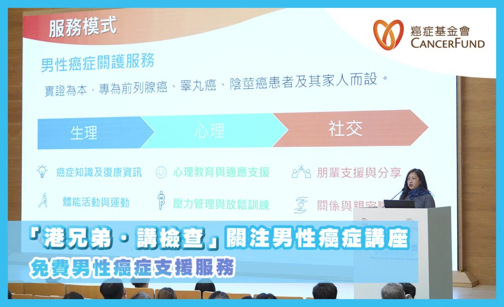 香港癌症基金會服務總監陳燕萍女士早前在「港兄弟•講檢查」關注男性癌症講座中,為大家講解癌症基金會的免費男性癌症關護計劃。計劃專為前列腺癌、睪丸癌、陰莖癌患者及其家人而設,提供涵蓋生理、心理、社交與靈性四大需求的全面支援,所有服務費用全免。