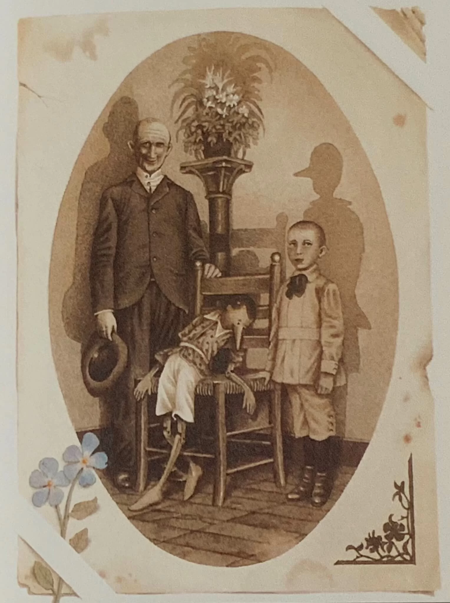 「想我還是木偶的時候,是多麼的可笑!如今我成了真的男孩,又是多麼的幸福!……」一本《木偶奇遇記》就以木偶畢拿巧的今昔自比作為結束,可是我們作為讀者也別將木偶的話看呆了。木偶並非真的就將自己以往的頑劣惡迹全盤否定,改過自新。一般的童話故事一旦發展到幸福的境地,馬上結束,皆因為說故事的人都知道幸福長久拖下去便會變成一件相當蒼白乏味的情事,反倒是以前的種種災難、不幸、波折、煩惱,才是構成故事趣味旳主要成因。木偶的一句「是多麼的可笑」裏面隱藏了幾許懷念和感嘆,大有依依不捨之情。細想人生也是如此罷。《木偶奇遇記》(Le Avventure di Pinocchio,1883年初版單行本)的配圖版本多如天上之星,而且佳作如林,其中Roberto Innocenti的插圖本相當不錯,結尾的一幅尤其可圈可點。那是一幅發黃的老照片:變成真正男孩的畢拿巧一本正經地和父親格必多站立左右,中間那沒有生命的木偶頹然挨着椅子;但是最耐人尋味的是畢拿巧身後的投影依舊是個長鼻子的木偶;真的是江山易改,本性還在;修行千年的狐狸,一個不小心還是會露出尾巴。那才是充滿情味意趣的一刻,雖稍縱即逝,卻直見性命,亦即是洋人說的the moment of truth是也。
