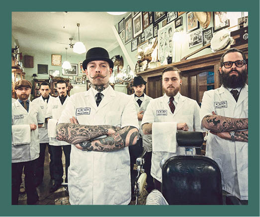 最後是那些師父的造型,基本上他們一定要是這套宗教教義的完美示範單位,這款「型人人辦」才能繼續開枝散葉呀!上文提過的「油頭」和「大鬍子」(有時「大鬚子」也OK)是個基本配飾之外,通常還搭配三十至五十年代感覺的西裝,另外最最重要的還有兩條「tat滿晒too」的大花臂!不是說唔肯紋身就唔俾入行,但越花碌碌在這個行業中就好似越有台型越professional囉。