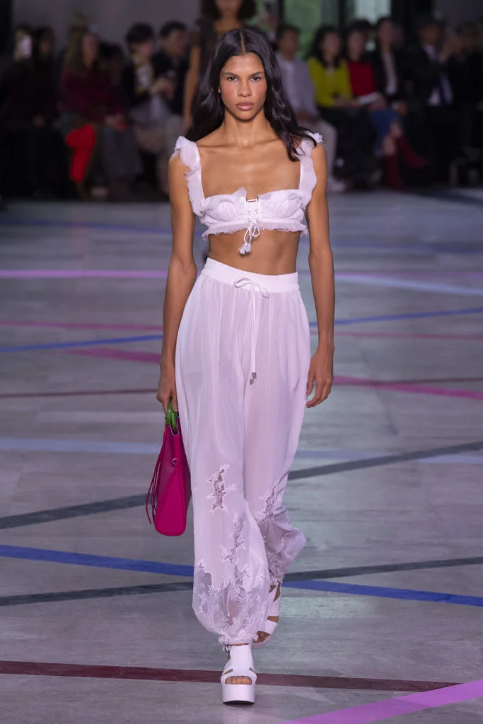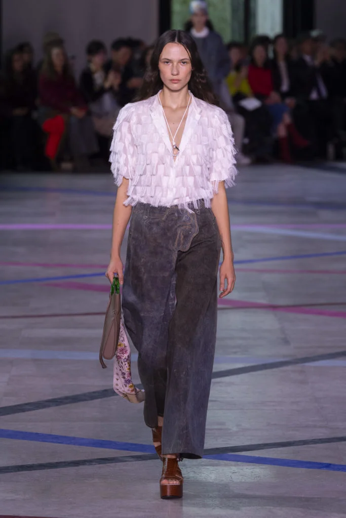 本季服裝以馬的優雅與速度呼應 70 年代嬉皮的浪漫叛逆,成為靈感核心。色彩以菸草棕、咖啡色、馬鞭草藍紫、黑白為主調,交織亮玫紅、鈷藍、民俗石色,既映照日光下嬉皮的灑脫漫遊,也折射夜幕disco舞池的電光閃爍。女裝以大喇叭褲搭配背心,或蕾絲上衣搭配軟料下身,呈現「長加長」的慵懶氣息;軟料套裝營造鬆弛卻不失挺拔。雪紗、蕾絲與斜紋棉麻印花隨步伐搖曳,馬鞍曲線幻化為口袋結構,蕾絲短褲勾勒輕盈律動。造型以混搭展現自由精神:古董衣與喇叭褲、手勾針織比基尼與西裝的碰撞,流蘇與牛仔、睡衣與正裝,在衝突中交織和諧。從白日嬉皮的詩意倦態,到 Studio 54 鏡球下的迷幻光影,本季以柔中帶剛的語言,書寫女性多重姿態,凝聚「當代東方視角下的自由靈魂」。