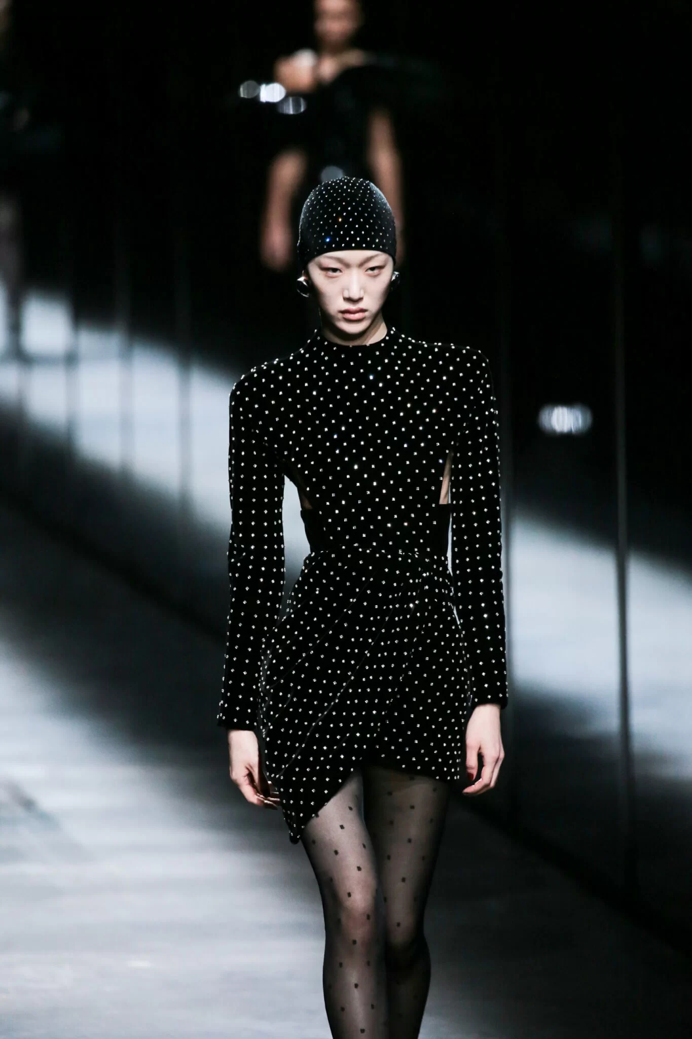 尾段模特兒刻意走到半透明的鏡後走騷,穿上在黝暗燈光下的螢光衣服、鞋子,十分科幻,亦像午夜舞會中的dancing queen,長羽毛皮靴,閃亮的裙子,凡此種種正是設計師歇力將品牌衣服打造成最適合引人注目的戰衣。