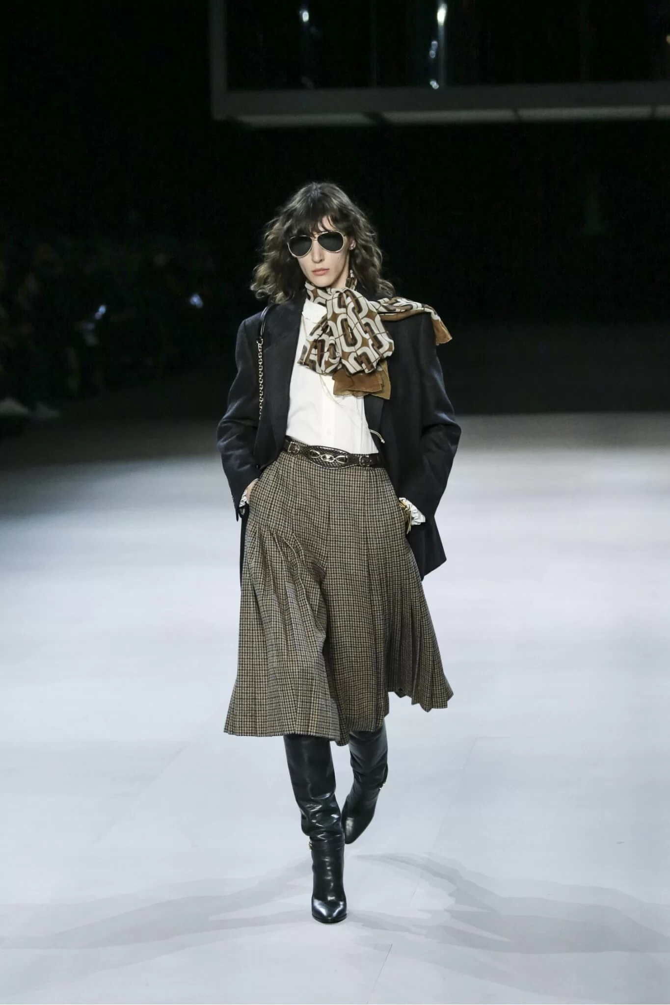 出場的深藍色西裝、配搭七分A-Line裙和黑皮靴,並有絲巾和腰帶的點綴;或是條紋恤衫、牛仔褲和啡色大衣,配搭暗紅色皮靴,讓人聯想起70年代的Celine。類似這樣的外套、上衣和半截裙的配搭造型貫徹整個系列,黑色的比例也明顯下調了不少,剪裁則以合身取代以往的過度纖瘦。若你翻查六七十年代的Celine,確實就是這樣的風格,自信、優雅、注重比例和細節。