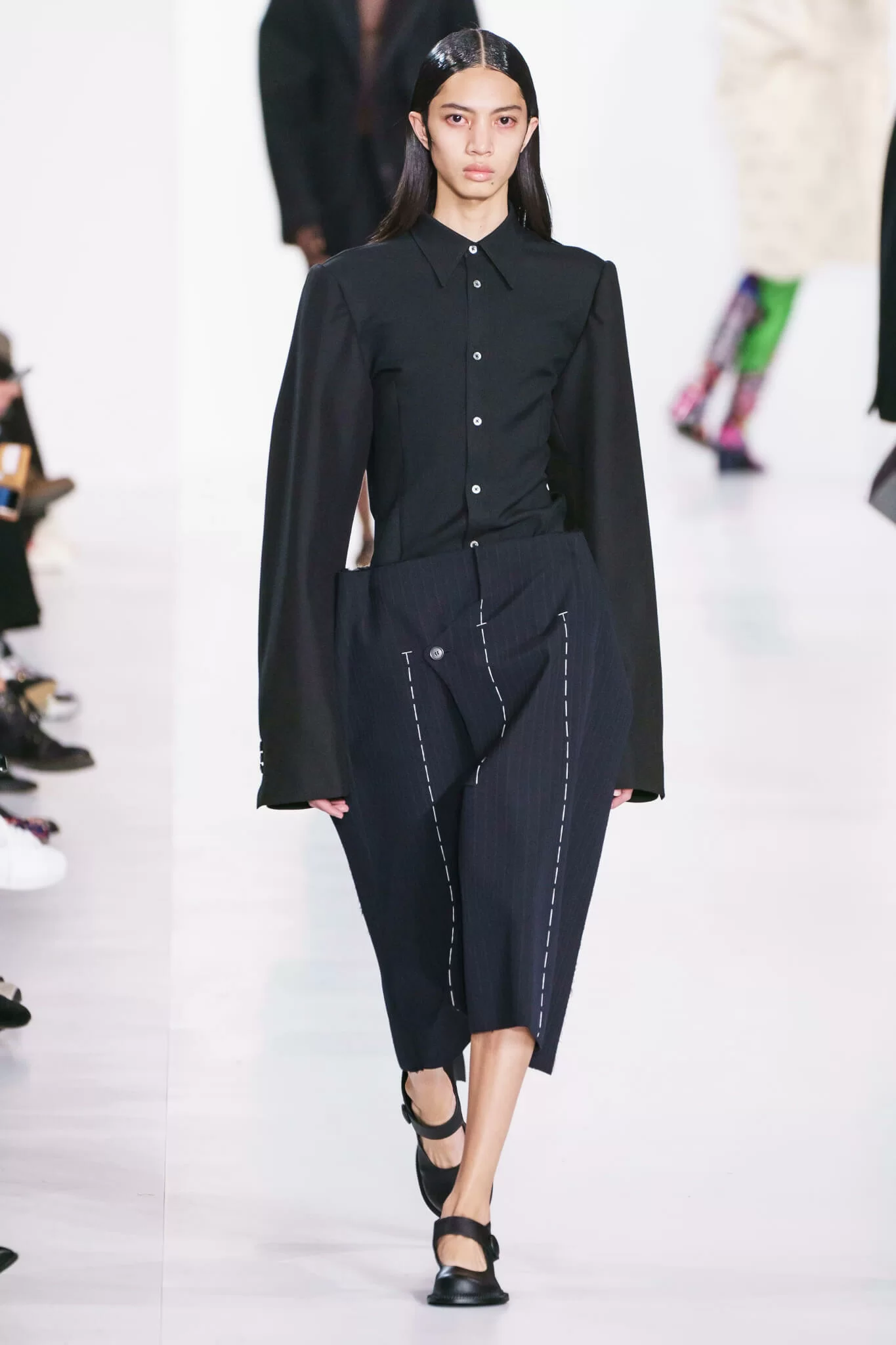 John Galliano的鬼才在於他永遠讓人預期不到,在Maison Margiela較早前的高級訂製系列,他才以極致的頹廢為主題,展示了一個色彩瘋癲、極盡誇張,讓人眼花的系列,到今個FW19系列,卻是突然回歸平淡,黑、灰、藍成了衣服色調,著重線條與剪裁,回歸Margiela式的解構主義。