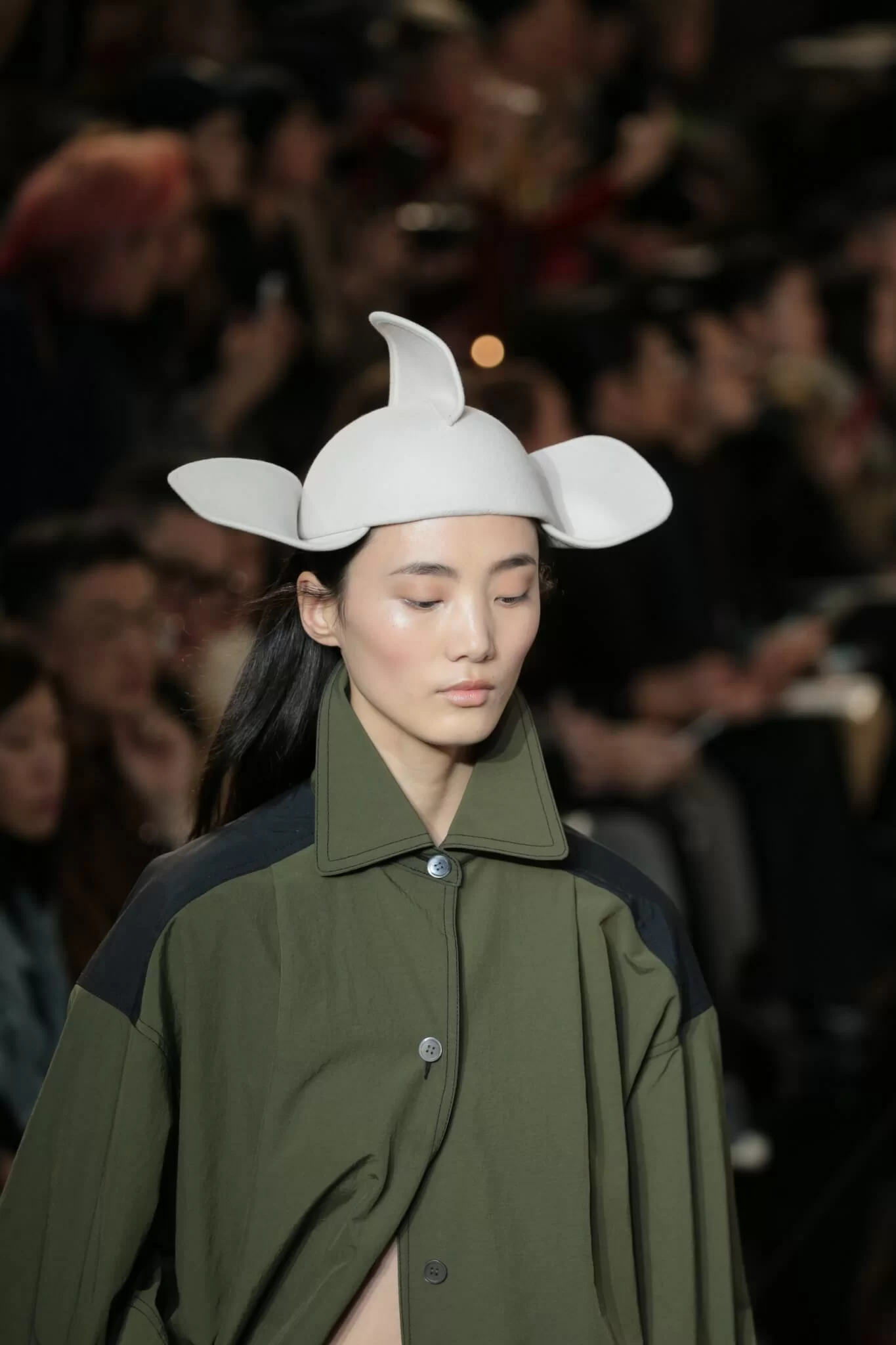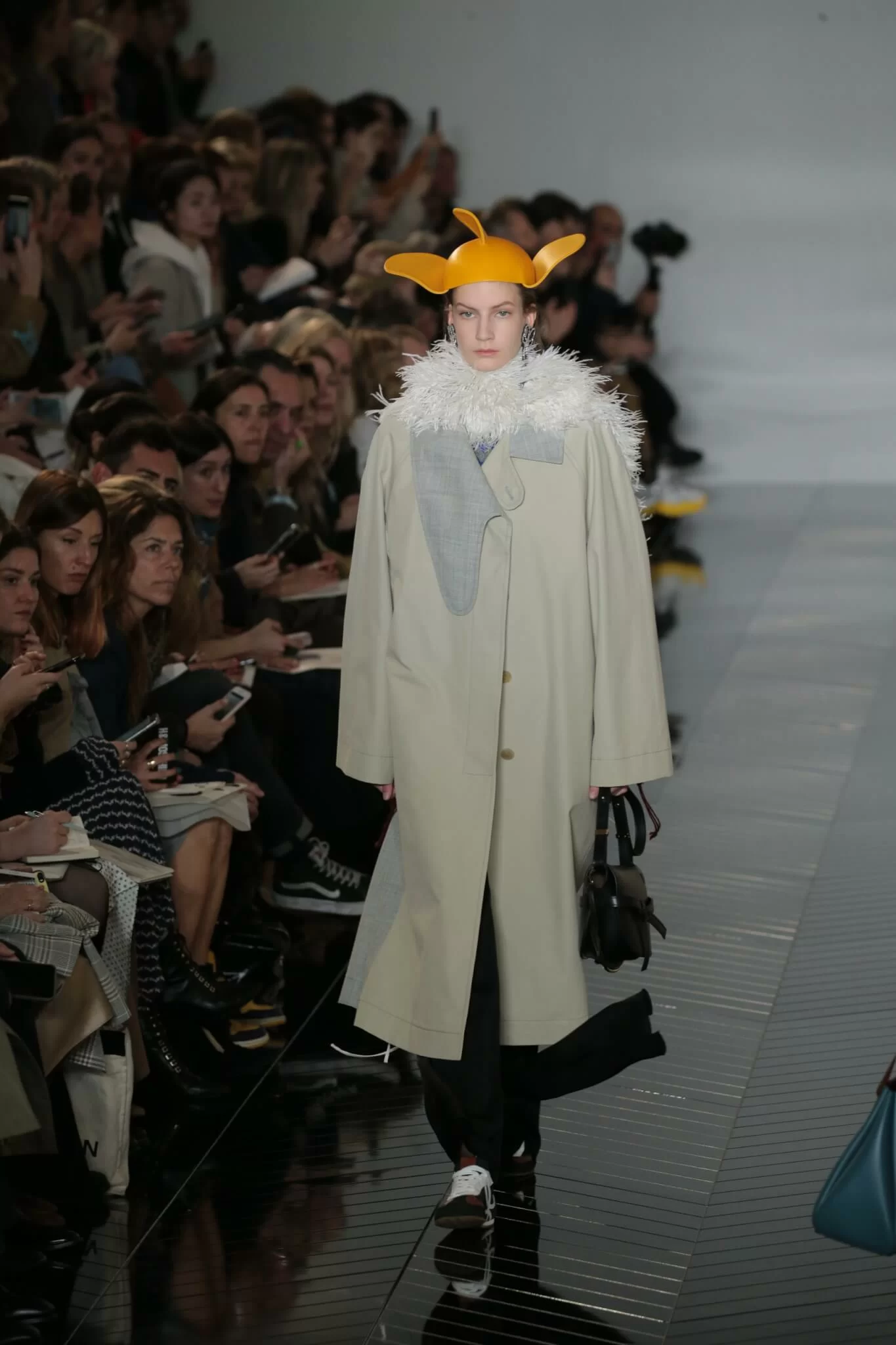 今年一月男裝時裝周,品牌率先在FW19男裝系列開騷前就發佈了廣告海報,到今個FW19女裝系列再照辦煮碗,率先在巴黎街頭貼滿系列海報,讓人未開騷先意會當中的氣氛及主題。品牌找來Steven Meisel掌鏡,以現今世代的溝通語言emoticons為靈感,在充滿色彩和玩味的背景中融入FW19的衣服配飾,例如當中一張模特兒Julia Nobis頭戴黃色絨帽、身穿黃色冷衫,在鏡子中反映了皺眉的模樣,正是表達Emoticons中的憤怒情緒。到了天橋上,這頂絨帽幾乎貫穿了整個系列,原來是J.W. Anderson受三藩市一家由中世紀便開始造帽的品牌Coret啟發,Coret的帽子形狀立體有趣,又經常融入羽毛、寶石等裝飾,J.W. Anderson因此就造了FW天橋上的這頂有着兩隻耳仔的「Propeller」帽子,玩味十足。