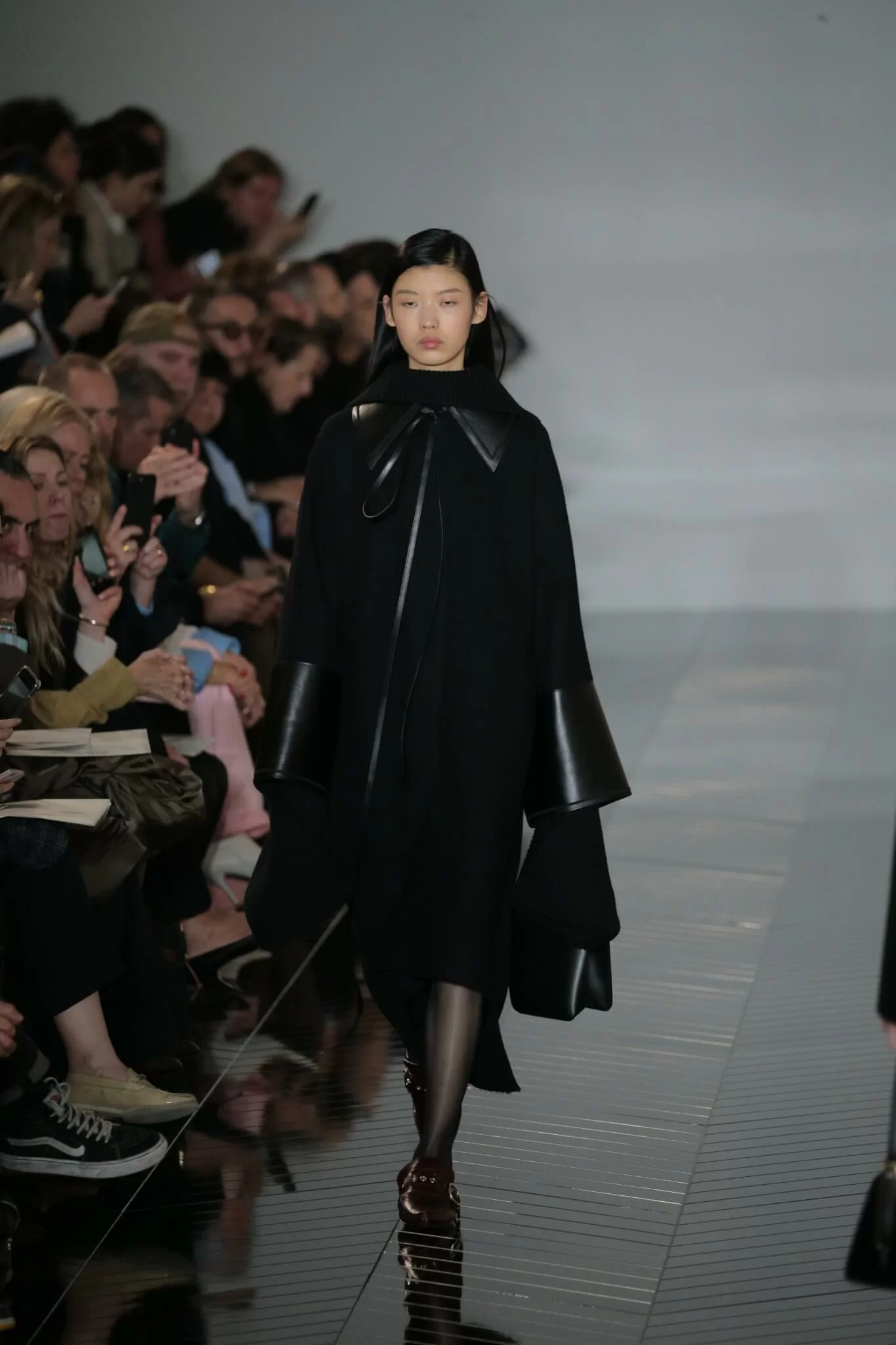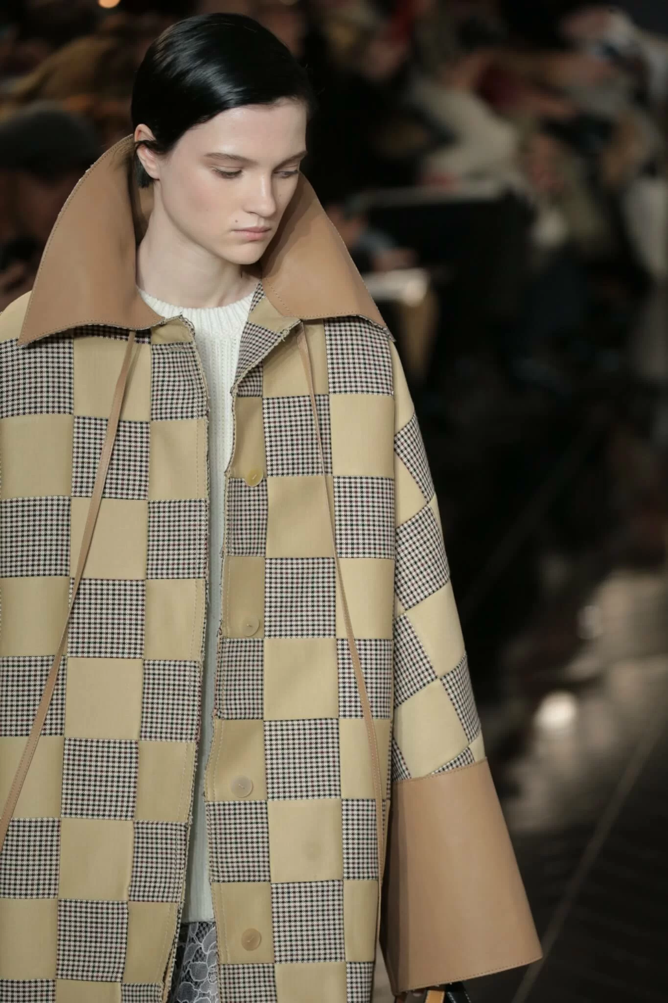 在Loewe今個FW19系列行騷之前,巴黎街頭已到處可見系列的廣告海報,為開騷作出預告。其中一張在七彩糖果店中取景、由Mona Tougaard擔任模特兒的海報上,她穿上了線條精準利落的黑色大褸、頭戴玩味十足的絨帽、手挽會亮燈的最新Straeter Lite-On手袋,正是Loewe FW19天橋上的首個造型,為整個系列下了註腳。