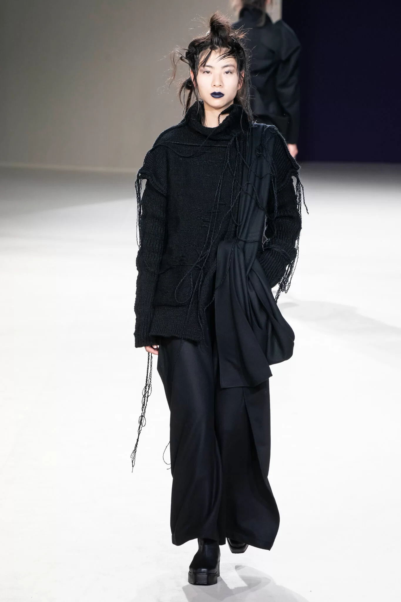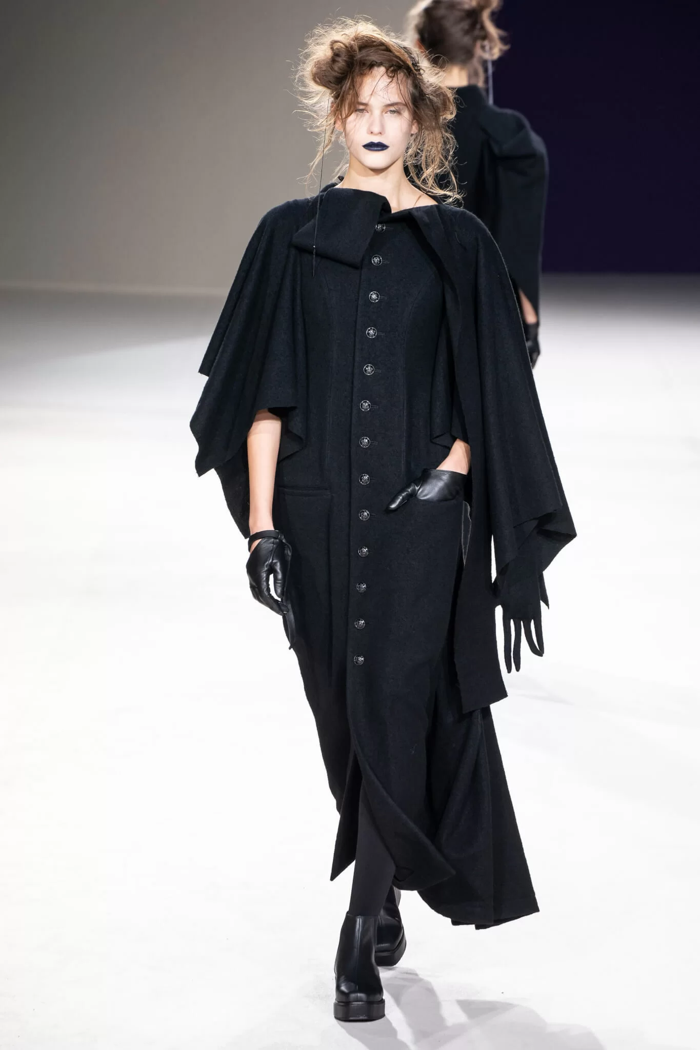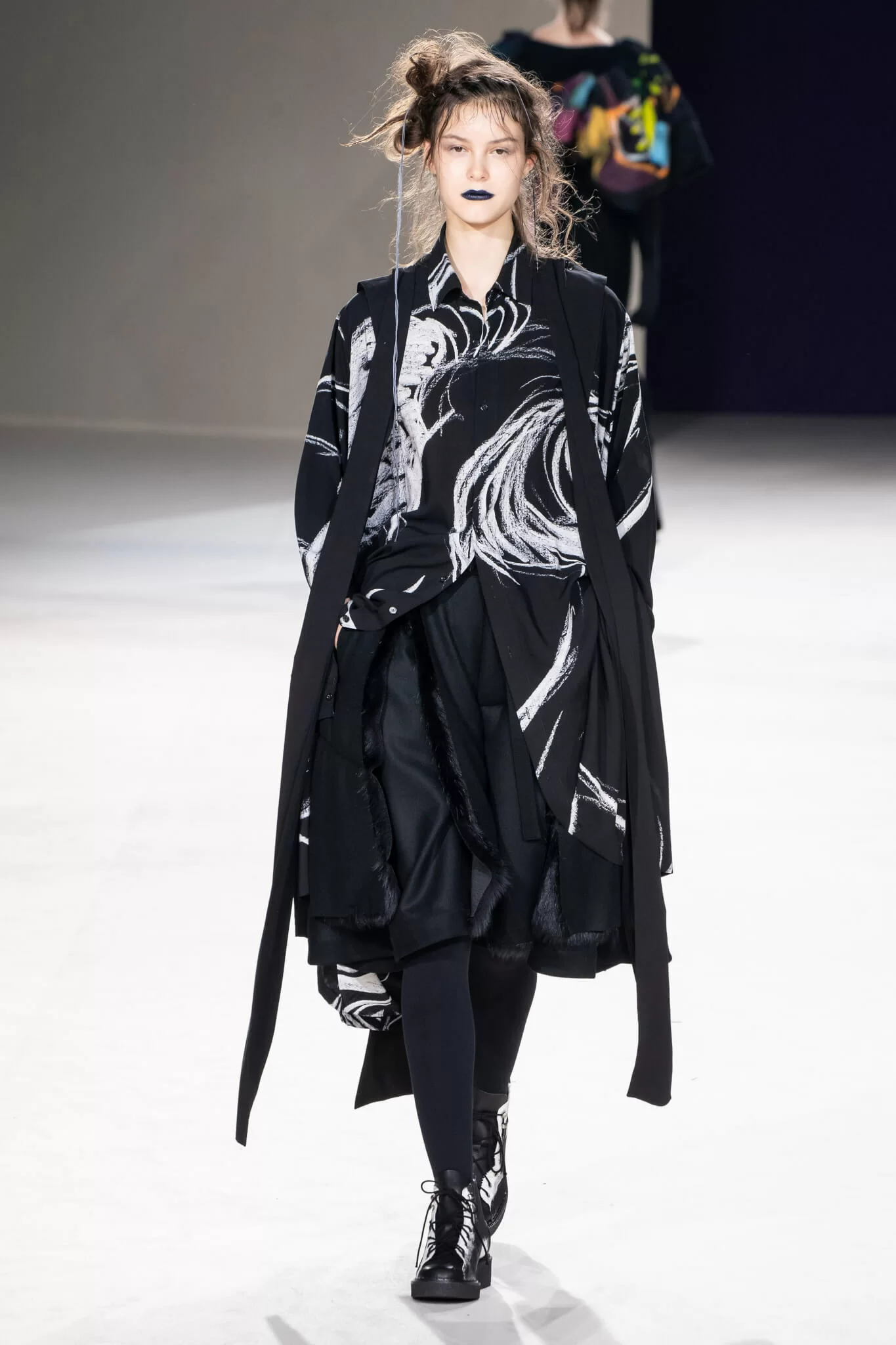 現今的時裝界變化急速、繽紛絢爛,Yohji Yamamoto十年如一日的不變反而難得又耐看。山本耀司直言這個FW19系列是他對現今時裝世界的回應:「我像個小女孩,造衣服是如此好玩,我在享受當中的過程,而不是一個時裝大師。」他回到了最初,當造衣服還是用雙手DIY的日子,所以這個系列在一貫的黑調和垂墜感中不乏拖尾的鬆散線頭、胡亂手畫的繪圖、自然隨意的刺繡等細節,藉此表現時裝原本的純粹。然而來到今日,衣服本身的設計已不再重要,嘩眾取寵引起話題才是大勢。山本耀司不否認,當中一套絨裙大褸中拼接了舉中指的手套,是對時裝界的控訴,也只有如他這般的時裝大師才有這樣的能耐,在時裝洪流中仍然堅持做自己。